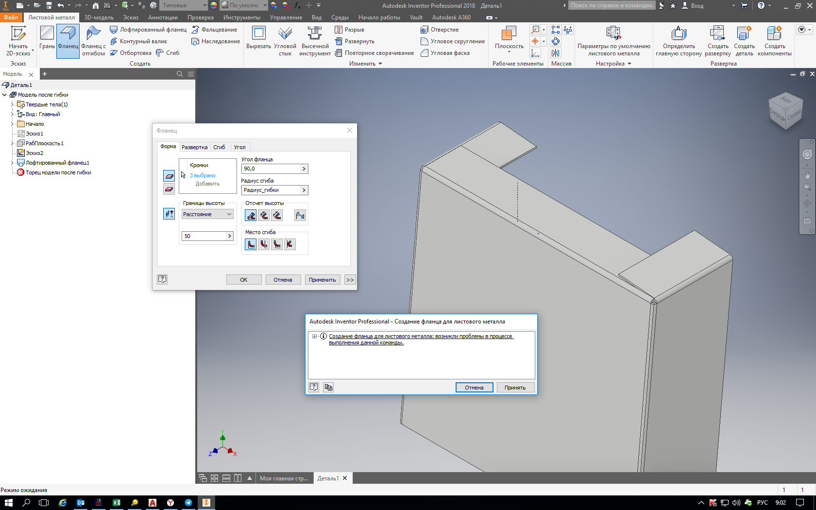 В общем недавно начал пользоваться данной программой, очень удобно проектировать детали из листового материала, но возникла проблема которую я не могу решить, а именно, если у меня есть кожух не прямой, а под углом к вертикальной плоскости, допустим 5 градусов, то я не могу создать фланцы параллельные горизонту и стыкующиеся под 45 градусов, может кто знает как решать такие ситуации? Может как-то по другому нужно решать вопрос? Я пробовал делать фланцы по отдельности, но тогда они сливаются в цельный элемент и даже после создания двухточечного разрыва, развертка не строится, а мне важно построить развертку в итоге и выдать на производство.