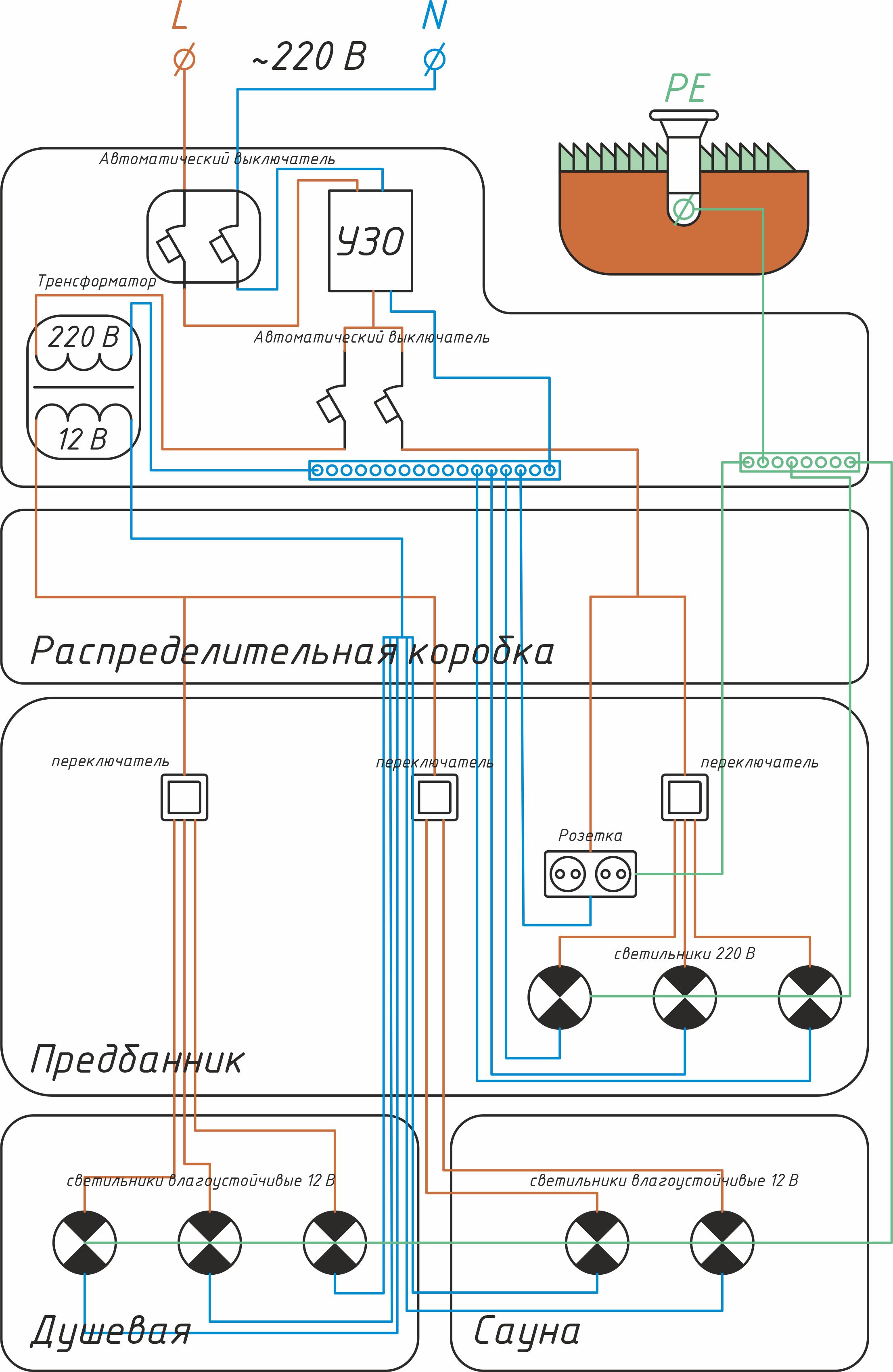 Нарисовал вот такую схему. Будет ли она работать? В чем её минусы? как вообще правильно подключить баню, чтобы было безопасно?