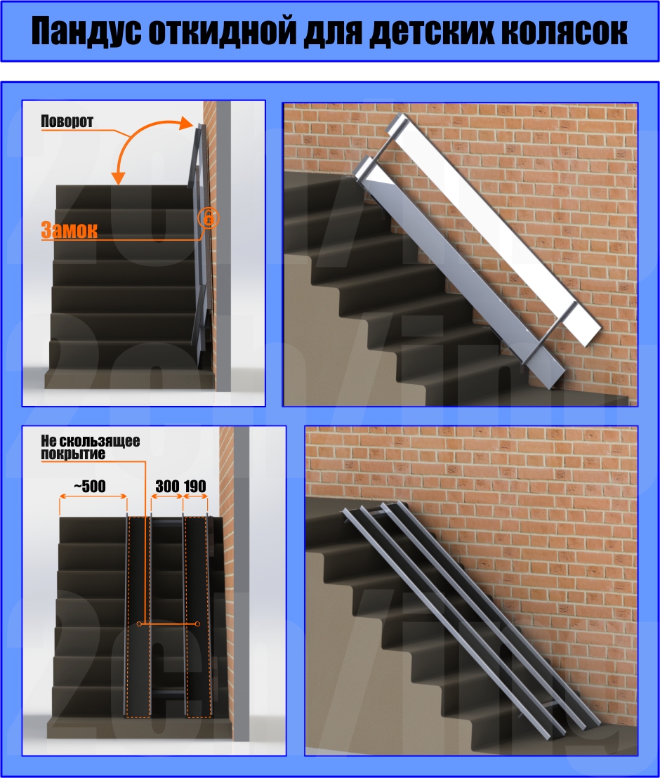 >>2099 Можно зделоть откидным только один трак и его же оформить в перила. Будет и легче, и практичнее. Олсо >Допустимый угол уклона пандуса должен быть не круче 1:20 (5%), а максимальная высота одного подъема (марша) пандуса не должна превышать 0,8 м.