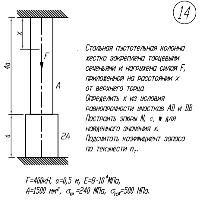 Ничего сложного, понимаю, как решать. Но вот непонятно про условие равнопрочности AD и BD, ибо самих этих AD и BD не обозначено. По логике, поскольку пределы текучести на сжатие и растяжение разные, а напряжения самые большие на длинной и узкой колонне, стоит взять равнопрочность сжимающегося участка тонкой колонны под силой F и растягивающегося над ней. Стоит делать так или иначе?