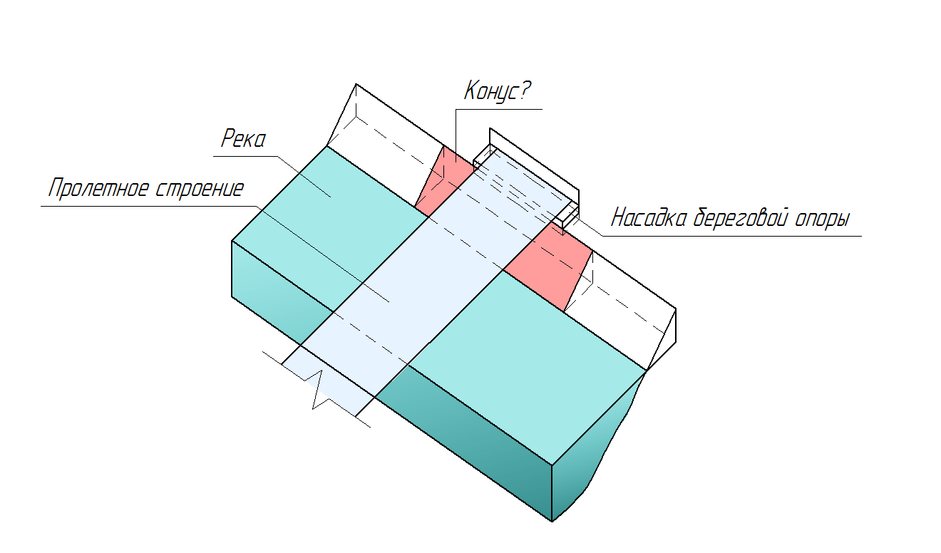 Вопрос к мостовикам и дорожникам: На приложенной схемке выделил красным оттенком насыпь, примыкающую к устою. Если тело насыпи не имеет форму усеченного конуса, то она всеравно именуется конусом или как-то иначе? Просто насыпь береговой опоры?