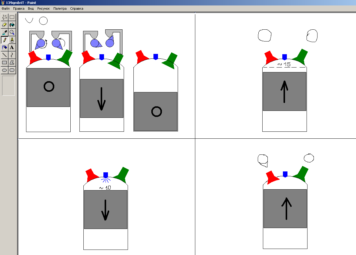 >в. Инжектор мог бы понадобится, если бы двигатель был с большей степенью сжатия (40,50,60 и выше), чем у меня. А так, от впрыска после ВМТ сразу перед искрой, может быть только хуже — ведь тогда пропускается целый цикл наполнения, а это время охлаждения камеры сгарания новой порцией топлива, у людей, пытающихся пойти этим путём, после нагрузки на двигатель начинается детонация(и то не сразу!). Фиксица это стендовыми испытаниями, чтобы электроника подгадывала момент детонации и предпринимала какие-то действия, вроде впрыска водно-спиртовой смеси и лампочки снизить обороты, плюс ещё нужна хорошая система охлаждения, топлива в том числе, датчики детонации и всё такое. Мудрить с этим мне пока сложновато, и охлаждение у меня воздушное, поэтому я просто ограничюсь небольшой степенью сжатия и обычным циклом наполнения (карбюратором).