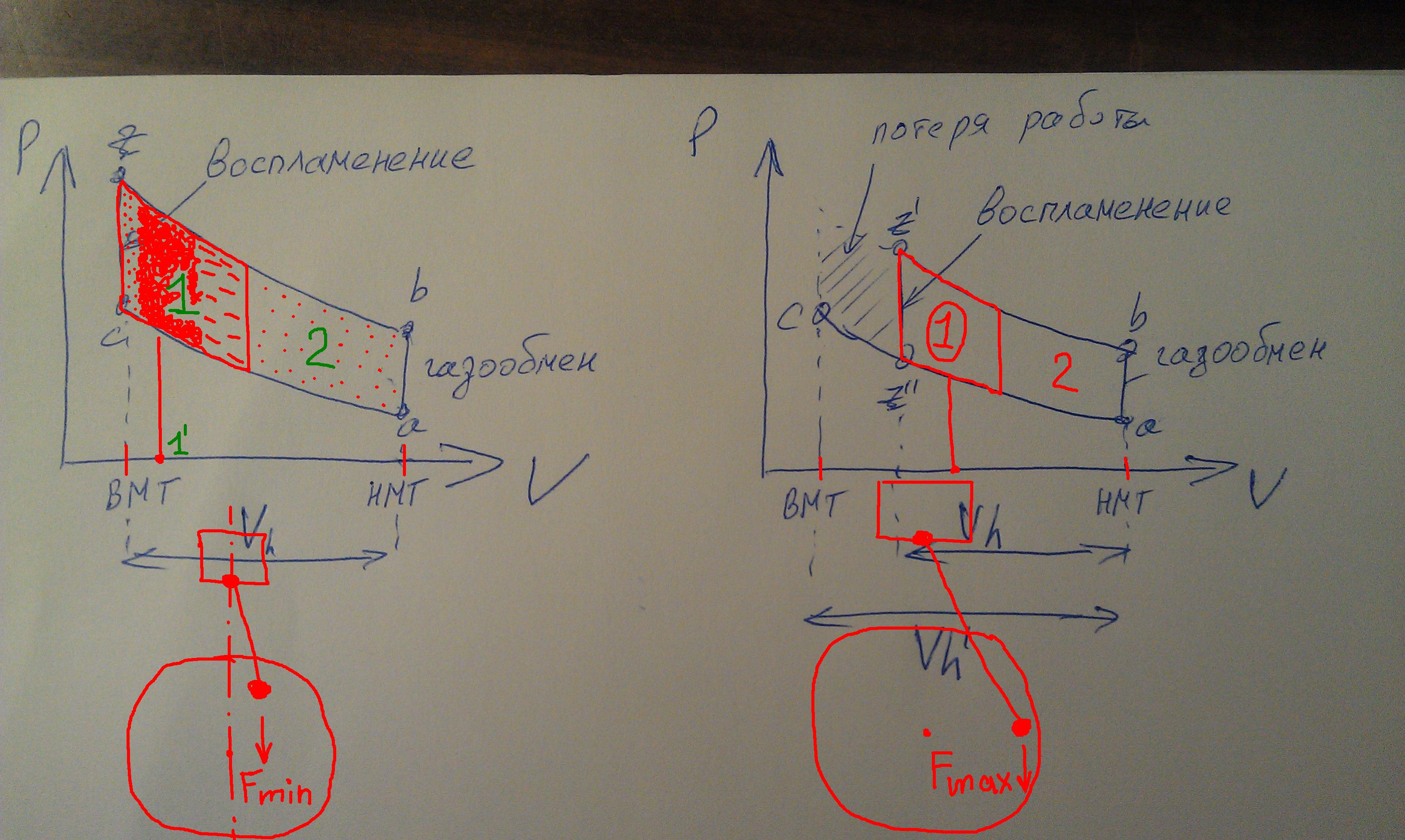 >а суммарная работа за цикл останется той же (если площади диаграмм одинаковые), либо меньше. нет же, о чём я и толкую, она будет больше из-за изменившегося воздействия на кривошип.