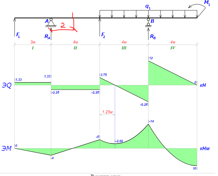 Sup /ing/. В общем такая хуйня, я пиздоглазое мудило. Помогите построить линию влияния для поперечной силы Q. Чувствую чакрой что именно в ней туплю. По проверке выходит -2,25,а если через линию влияния то 1. Даже в онлайн решалку забивал кусок балки с реакцией шарнира, нихуя, должно быть -2,25