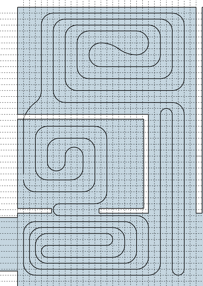 Инженерач, я хочу запилить теплый пол от полотенцесушителя (обратки горячей воды), этаж 4/5. Чтобы совсем уж не быть ебаным быдлом, не оставлять соседей с холодным полотенцесушителем и не разбалансировать гидравлику сантехникам хочу подключаться через узел подмеса с циркуляционным насосом. Только не обоссывайте, такую схему даже узаконить можно вроде бы, но много бумажной ебли - не хотеть. Сделаю по-тихому, но по-красоте, атвичаю. Коммуникации не меняли с момента постройки (семидесятые года), так что вряд-ли проводят ебовые гидроиспытания. Длина петли ~60м, общая площадь 14 квадратов. Изгибы петли 40(R20), 5(R10) 2(R30) R - радиус Схема петли пикрелейтед. Возле входной двери (снизу слева) и окна (сверху по центру) шаг 100мм, остальные участки с шагом 200мм. Асимметрия нижней петли обусловлена парковочным местом для обуви (спецом для зимнего сезона). Расстановка мебели учтена, петля идет только по проходной площади.