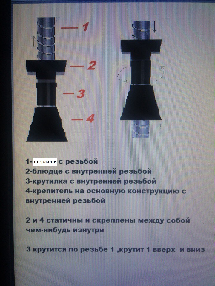 Доброго времени суток!) Подскажите,пожалуйста,каким способом можно реализовать эту конструкцию? Смысл в том,чтобы при кручении элемента 3,стержень(элемент1)отпускался вверх или вниз,а элементы 2 и 4 были статичны.