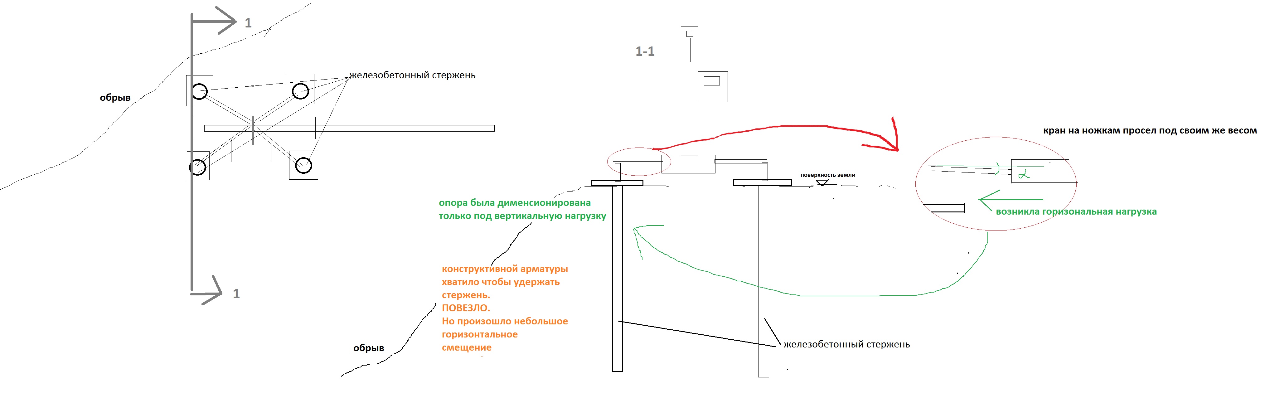 >>260 При такой схеме на стержень, при прогибе стяжек, действует не горизонтальная сила (хотя она там есть в микрохуй, от перекосов и неточностей), а нехуевый момент. И насколько я помню бетон отлично работает на сжатие,а на разрыв он не о чем, поэтому его разорвало, а металлюга отработала. Почему это произошло? Может перегрузка крана, либо слишком далеко стояла опора от оси, может какие тонкости с креплением опоры в грунте..