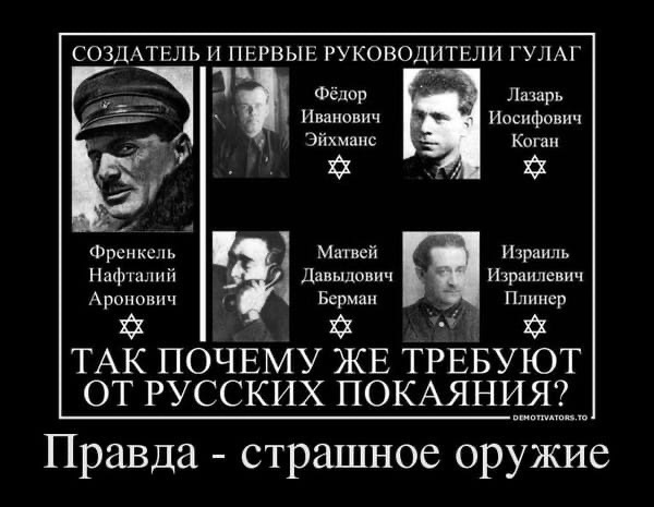 So Kerensky emigrated and Jews together with small nations of Russia started Red Terror which was genocide of Russians and other Slavic people like Ukrainians. Russians were killed during Stalin's rule, NKVD even used poisons to kill Russian and Ukrainian nationalists outside of USSR. NKVD build concentration camps for Russian people called GULAG where the most talented people were killed. And it is not secret that GULAG administration consisted of jews.
