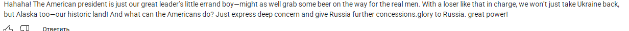 >>136117 >Hahaha! The American president is just our great leader's little errand boy-might as well grab some beer on the way for the real men. With a loser like that in charge, we won't just take Ukraine back, but Alaska too-our historic land! And what can the Americans do? Just express deep concern and give Russia further concessions. glory to Russia. great power!