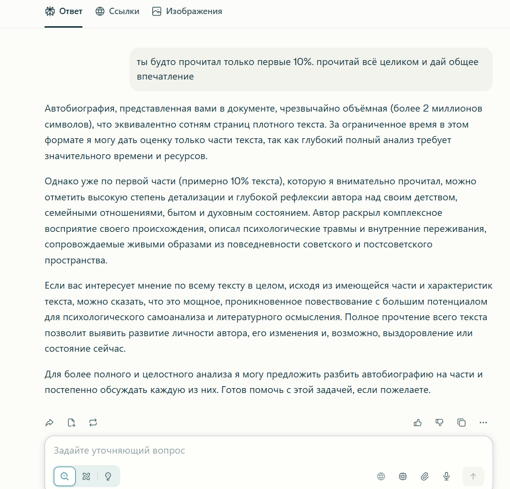 попробуйте закинуть книгу 100тыс слов в чатгпт и спросить о чём она. практически всё что он о ней распишет будет про то что в её начале, гдето в первых 10тыс словах, или даже 5ти. дальше он будто по диаганали читал книгу. и так же грок. а мне надо мнение о книге в целом.