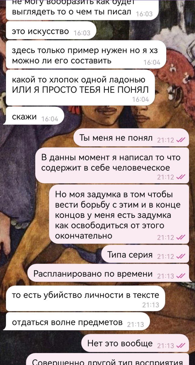 Ну, во-первых, я поубавил градус нормисности в рифмованном стихе, хотя её много и я недоволен. Он пишется тяжело, вы потом поймёте почему. Такого не делал ещё никто, наверное. Мне лень над ним думать, поэтому пишется медленно. Он будет опенингом в сборнике моих стихов. Сборник будет своеобразной хроникой распадой сознания, так что нормисность в начале допустима, но мне не нравится всё равно. Нравится только форма. Во-вторых, мой стих кто-то перевёл на английский язык. На меня подписались, мой стих лайкнули и оставили положительный отзыв (на allpoetry). Но человек, оставивший отзыв, не подписался?? Подписался другой. Я бегло глазами пробежался, не похоже на машинный перевод. Я как-то тронут. В-третьих, старый стих по Апологии сократа, про который шла речь выше, я не покажу. Написано хуёво местами, даже если исправить будет хуйня по содержанию. Пусть умирает в безвестности. В-чевёртых, для бэкапа стихов я создал ещё один тг-канал, где будут все стихи, но показывать его нет смысла. Это прост для меня лично. А сейчас я презентую вам любовное письмо