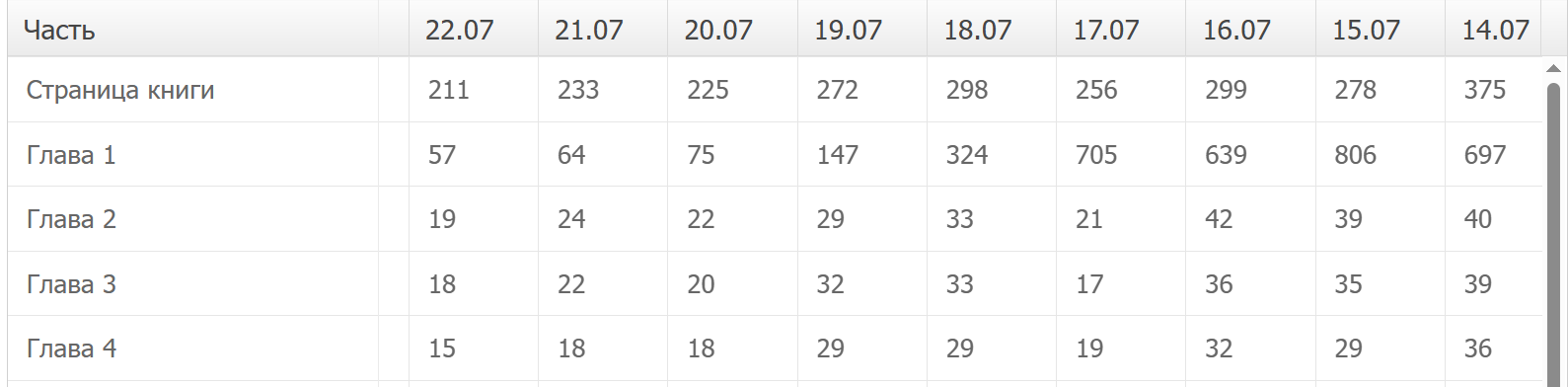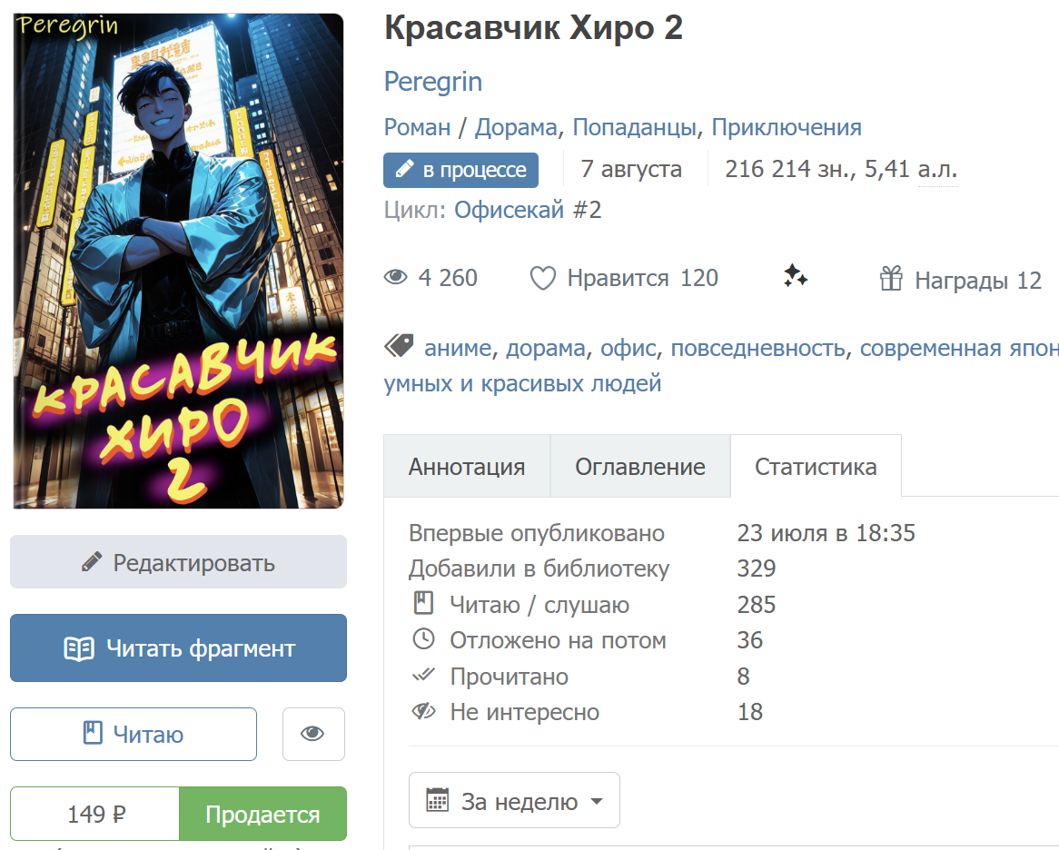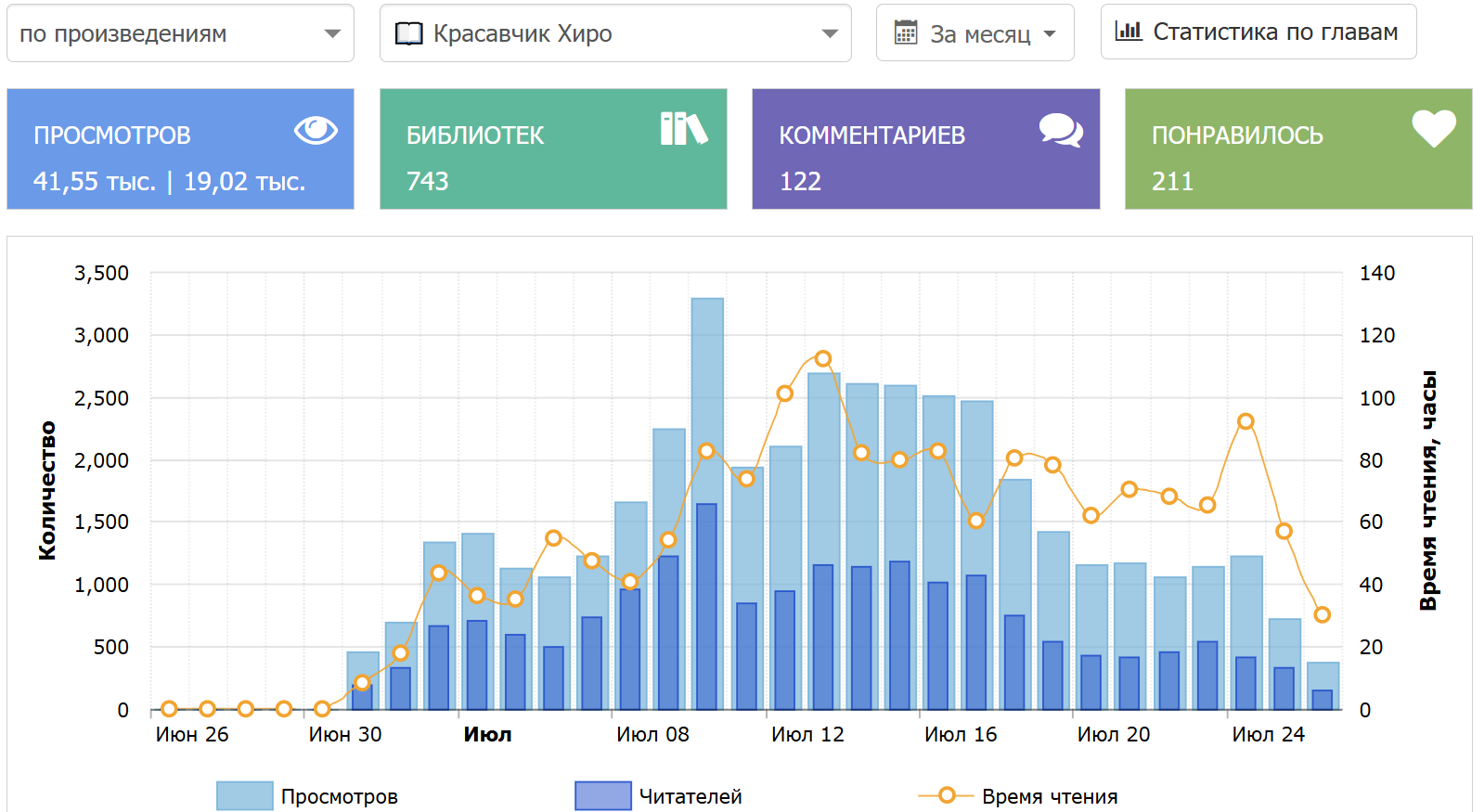 >>445217 Да в прошлом треде уже рассказывал. Дорама, вон она в шапке, "Красавчик Хиро". 16к рублей рекламных вложений, можно было и меньше, как оказалось. На поглавном графике хорошо заметно по первой главе, что 19 числа рекламу отключил. Продажи идут потихоньку. За два дня 35 человек купили второй том.