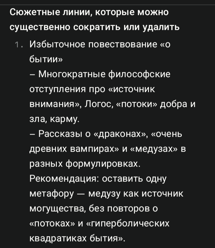 >>445233 >Да нахуй они никому не нужны. Синонимы хуево выдает, ошибки не ищет, логические связи теряет, постоянно повторяется или наоборот, хуярит в соседних абзацах абсолютно взаимоисключающие по смыслу вещи. Говно. Если хочешь, чтобы за тебя весь текст был написан, то да, именно так. Если же по мелочам, когда нужны варианты развития сюжета, например, то тут нейронка может хорошо помочь. Да, она не сама выдумывает, а миксует, но очень полезные варианты может выдать.