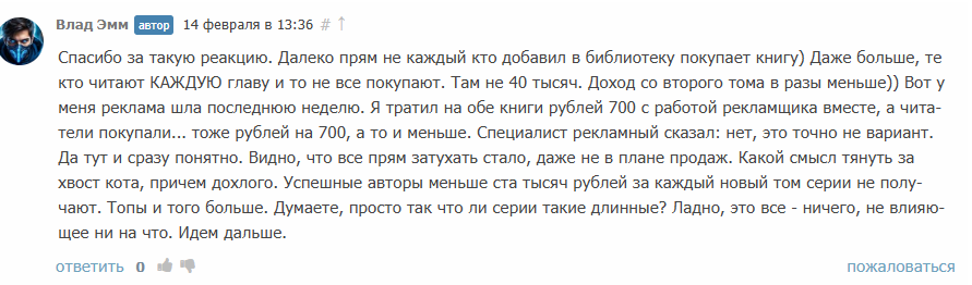 Получил коммерческий статус, сбылась мечта идиота, хехе. И вот у меня какое-то двойственное чувство. С одной стороны, конечно, приятно. Выполнил поставленную задачу, в успехе которой сомневался. А с другой стороны вот кто эти люди, которые мою книжку покупают? Зачем они это делают, я же не настоящий писатель. Короче, херня какая-то, не так я себе всё это представлял.