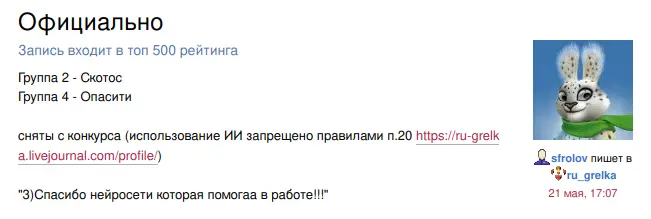 Теоретически что может помешать нейроанону прислать сотню другую рассказов нагенерированного и отредактированного слопа (работы на половину рабочего дня) и закончить принятие работ досрочно, а то и выиграть что-то просто по статистике?