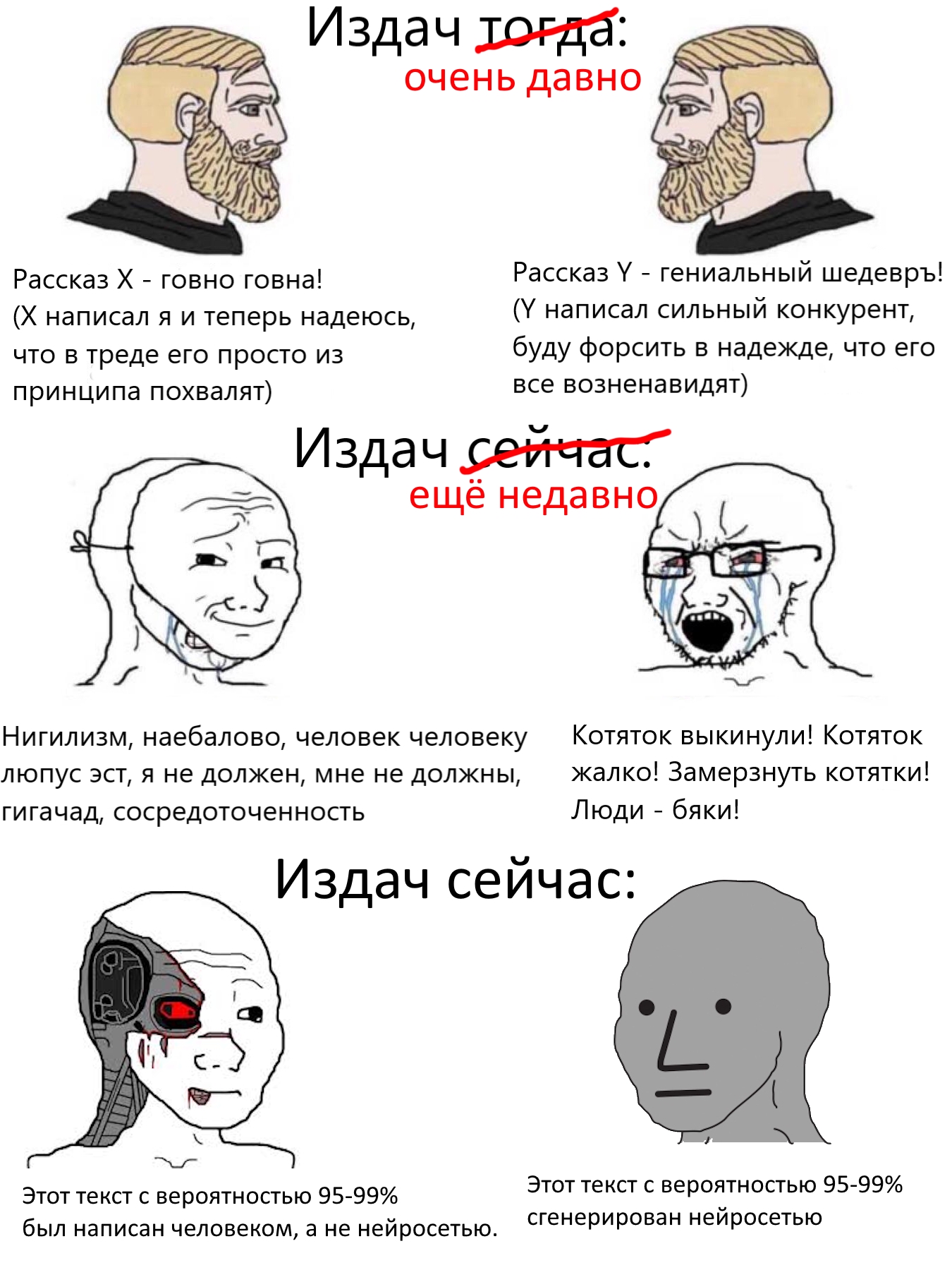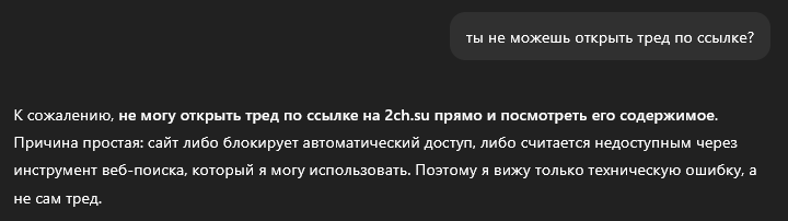 >>452049 Метод был такой. Читаю рассказ. Если рассказ похож по ощущениям на нейронный -- лезу в метаданные. Если в метаданных есть что-то сомнительное, например рассказ на 20к знаков написан за час -- сую в детектор. Если детектор показывает ИИ -- я его игнорирую, он все равно врет. Зато прошу у гопоты самым простым промптом (напиши рассказ на 20 тысяч знаков про вертолетчиков-людоедов) сгенерировать рассказ. Сравниваю. Гопота мне выдала не то чтобы идентичную копию, но нечто очень похожее, даже так же разделенное на дни-главы, хотя об этом я не просил. Уверенность не 100%, но достаточно, чтобы не заставлять Джеймсов читать нечто настолько сомнительное.