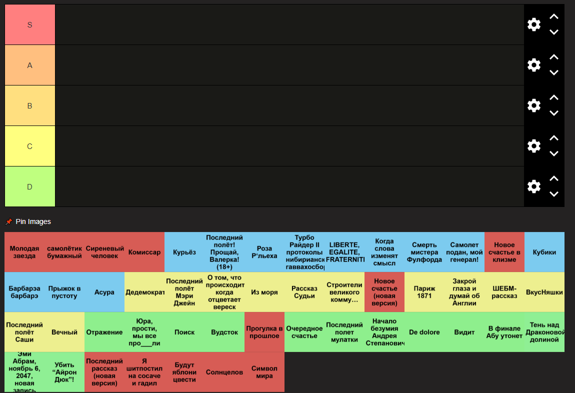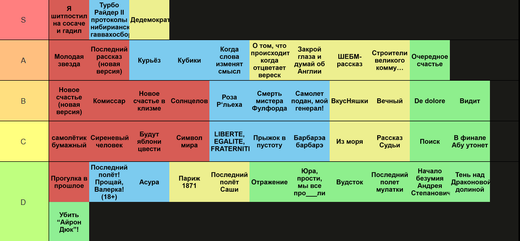 >>452068 >Ну я там лор шмотками сбривал чтоб походило на пост блогера. Вот именно что форма и рушит лор. Сколько тебе вам лет, сынок дедушка? Почему в далёком будущем, где Пелевин выпустил 45 романов, пишут так, чтобы влезть в яндекс-топ образца 2007 года? Если уж взялся экспериментировать с формой, то на форме и фокусируйся. Передавай посыл формой, передавай лор формой, ну ты понял. >>452071 >Я Алкоголик Соболезную. >и в выходные после смен Соболезную (x2).