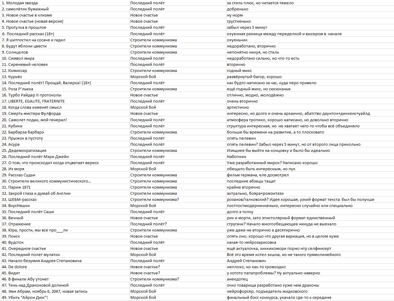 Блин, ОП, ты бы хоть приписывал красным текстом к отсеянным рассказам, за что (т.е. рассказ кончился, перенос строки и красным текстом причину "за что"). Интересно же.