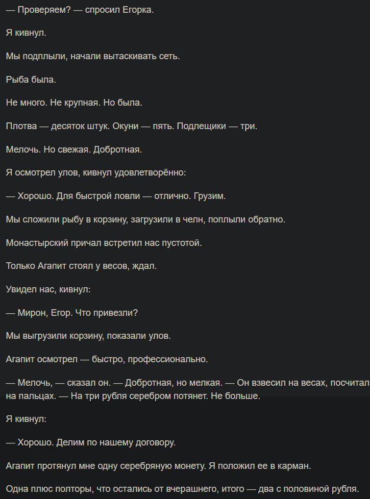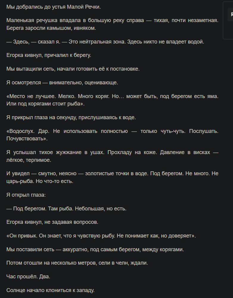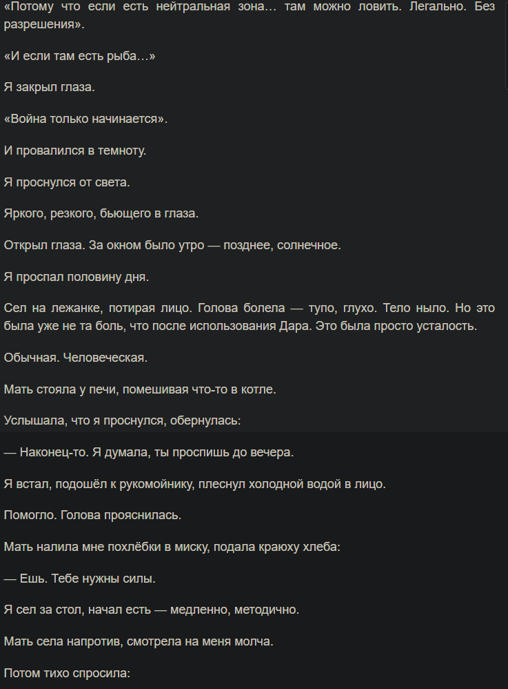 Мне прям даже интересно, что именно ты здесь посчитал признаками нейросетки. Но так-то похуй, если честно. Если автор умеет с помощью сетки сделать настолько увлекательный текст, то я только за.