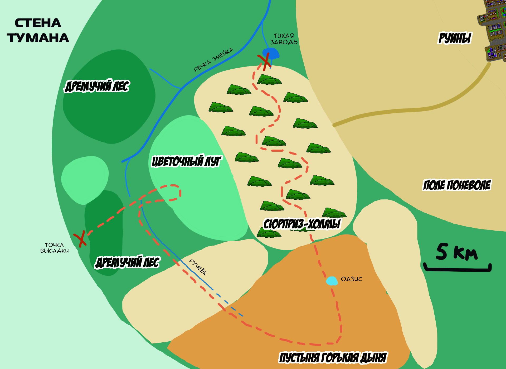 Расширенная карта местности, которую я дорисовал во время работы над второй главой. Форма мира за стеной представляет собой окружность ~60 км в диаметре, но я сбился и набросал неправильный круг.
