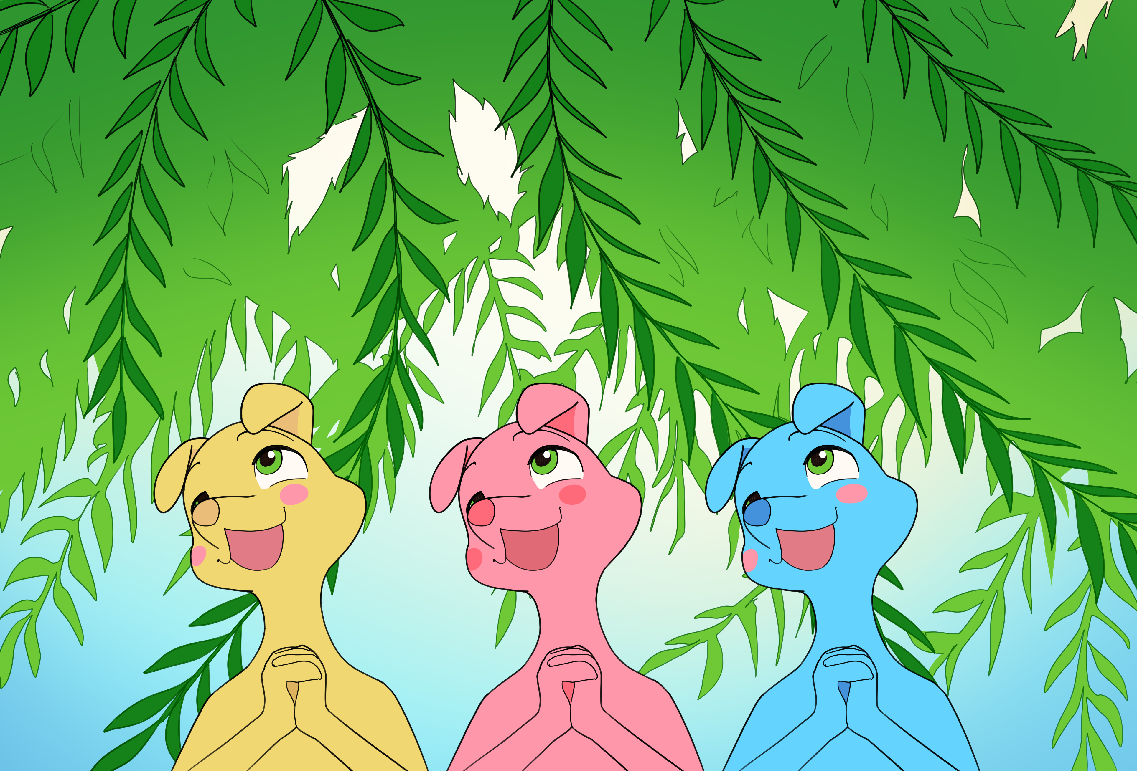Вначале не было ничего. Лишь лёгкий весенний бриз неспешно перебирал раскидистые ветви ивы посреди бескрайней пустоты. Первый Бог, всё это время сидевший под деревом, встрепенулся. От его шевелений пустота наполнилась явью. Из ниоткуда возникли три ярких всполоха, принявших вид худеньких собакообразных существ с вытянутыми мордочками. Мотыльками спланировав вниз, существа тут же принялись славить своего создателя.