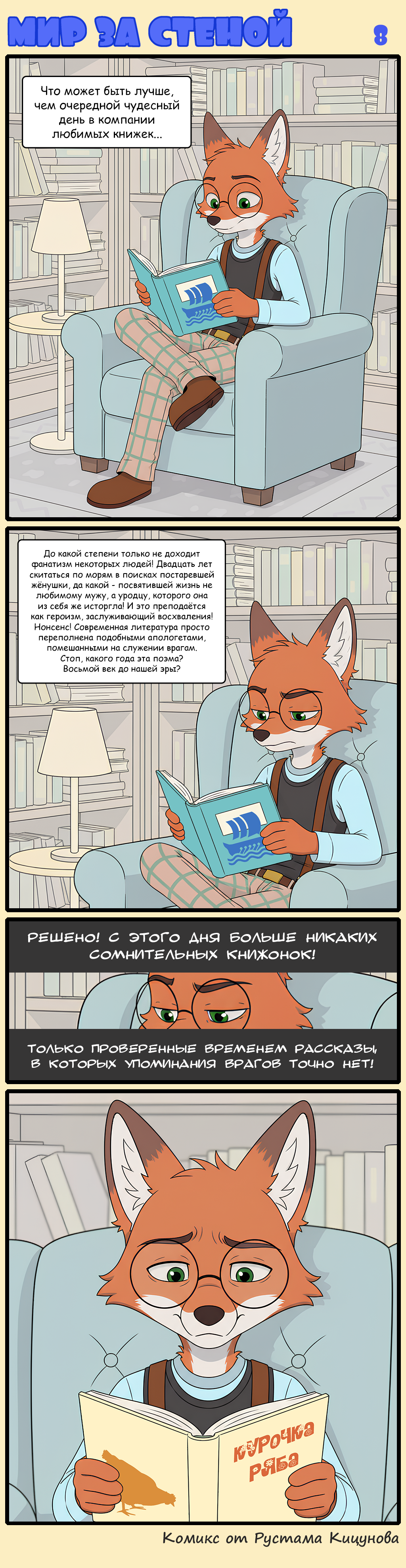 Дом неподалёку от обочины дороги выглядел внушительно и скорее напоминал крепость, чем жилое помещение. Полностью сложенный из бетонных плит, серый и угловатый, он походил на редут, разве что рва с крокодилами вокруг не хватало. Толстую дубовую дверь, окованную железом, казалось, не пробьёт и боевой таран. Представляю что думает Гостья. Что внутри живёт какой-нибудь важный военачальник два метра ростом и в железных латах. Рядом с дверью висела крупная деревянная табличка с отчётливо выделяющимися бордовыми буквами. «Друзьям стучать три раза. Врагам не стучать, уходите. Почтальону стучать не переставая.» Тильда стукнула кулачком три раза. Через минуту в узкой смотровой щели рядом с дверью мелькнула тень, а вслед за этим послышался звук открываемого засова. – Тильда, – по ту сторону послышался растерянный глухой голос. – Я не ожидал твоего прихода, да ещё и с друзьями. Ай! Похоже, засов был тяжёлым. Наконец, дверь открылась и нашему взору предстал хозяин дома. Тёмно-зелёный пиджак, который он носил, был совершенно невзрачным, но отливающие глянцем клипсы подтяжек, поддерживающих безразмерные клетчатые брюки, сразу привлекали внимание. Его шерсть была однотонно рыжей и взлохмаченной, лишь на кончике пышного хвоста выделялась белая кисточка. В основании вытянутой мордочки хозяина были закреплены очки с круглыми стёклами, а огромные тёмные круги под глазами только сильнее подчёркивали его черезмерную худобу. – Вы ведь одни? – обеспокоенно спросил владелец крепости, оглядывая дорогу, которая была совершенно пуста. – Тогда заходите, добро пожаловать. Мы пересекли порог дома, оказавшись в просторной прихожей, заставленной книжными шкафами. За нашей спиной тотчас закрылся массивный засов. – Так, как же там было... – замялся хозяин. – А, пункт один, представиться. Позвольте представиться. Меня зовут Цельсий. Моя литера Л, что означает Логово. Ага, да. Вроде ничего не забыл, – запинаясь через слово, выпалил он, поправив на голове совершенно неуместный в помещении котелок. – А, точно, снять шляпу, – и Цельсий тут же исправил ошибку. – Привет, Цельсий, – прикрыла рот рукой Тильда. Можно было подумать, что она сдерживает смех, но только я понимал, что на самом деле девчушка очень рада видеть старого друга. – Ох, да. Приветствую. Представишь своих спутников? – хозяин навострил рыжие ушки. Тильда назвала нас по именам. – Угу, ясно. Что там дальше... А, пригласить гостей в зал. Прошу. Разуваться необязательно, ведь я не смогу дать вам тапки по причине их отсутствия. Прости, Тильда. Мы переместились в гостиную, которая оказалась попросторней. Вся она была заставлена книжными полками на манер прихожей. – Так, чем желаете угоститься? Хотите чай или может кофе? Хм, хоть ни того, ни другого у меня нет, но правила предписывают предложить вам из вежливости. Не стесняйтесь, присаживайтесь. Хотя кресел у меня тоже нет. Но можете сесть на пол, если хотите. Кстати, Тильда, чем обязан твоему посещению? Девчушка молча показала хозяину метлу. – Снова хочешь прибраться? Ты же подметала у меня в прошлом месяце. Хотя Тильда приходила к нему уже множество раз, недалёкий книгочей так и не догадался об истинной причине её частых визитов. В воздухе повисла тишина. Гостья начала гулять по залу, осматривая корешки книг. В основном, научная фантастика, хотя иногда попадались и уч