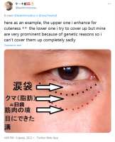 >>168622 То о чём ты говоришь называется эпикантус, и она подрисовала вообще не его, а просто стрелки. Они визуально глаза вширь растягивают, чтобы лупоглазости меньше было. С её широкими глазами это норм тема, так много тянок делает.