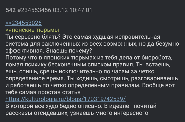 Какой-то полуграмотный высер копиаратерши, получающей рублей 50 за такие "статьи" А там главное доказательство "адскости" японской тюрьмы - фрагмент обрыганско переведенного на русик и самодеятельно озвученного в пердящий микрофон японского фильма, где заключенные работают в тюремном цеху и отпрашиваются пописать у надзирателя.