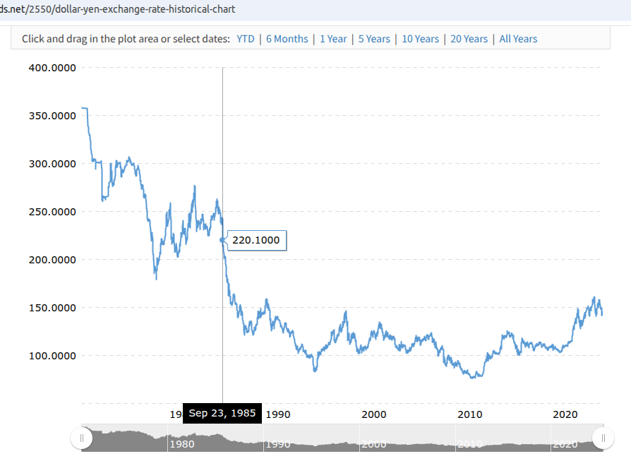 В этом отношении любопытно, что у большинства людей курс йены ассоциируется с 100 йен за 1 доллар и сейчас все жалуются именно на то, что йена превращается в мусор и 150 за бакс - это пиздецки дорого. Хотя именно в эпоху того самого экономического чуда и индустриального рывка доллар стоил и по 200 и 300 йен. Но кто же из людей будет открывать историю дальше, чем история его браузера, правильно?