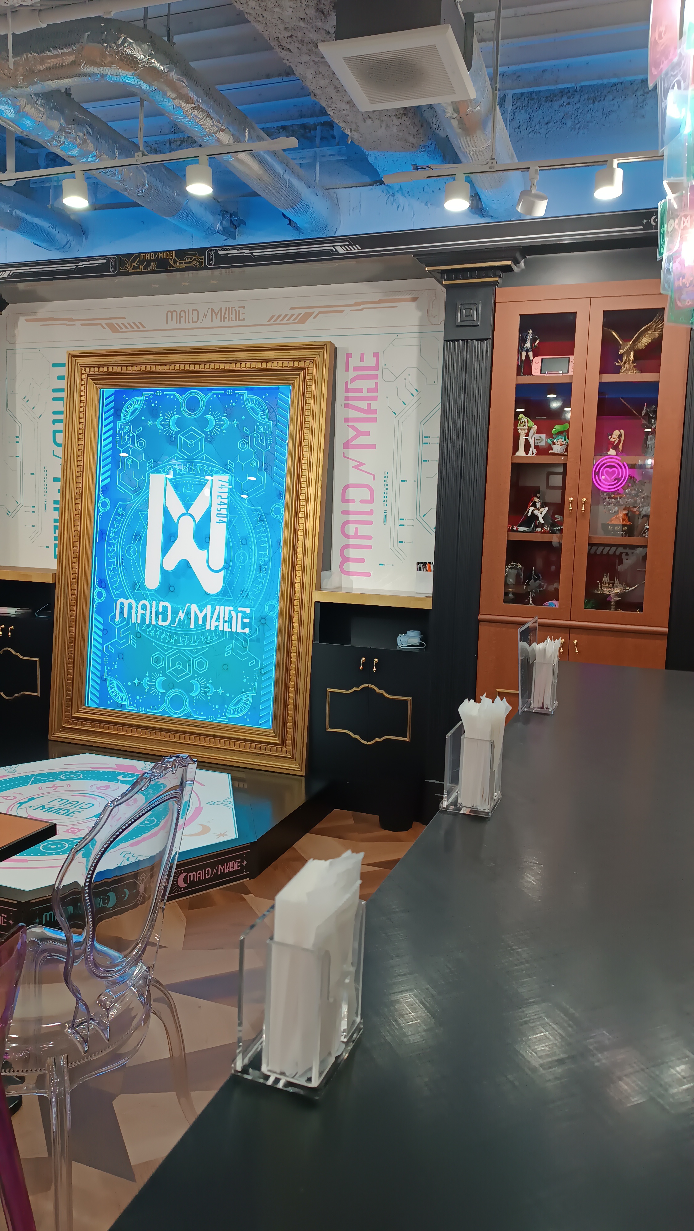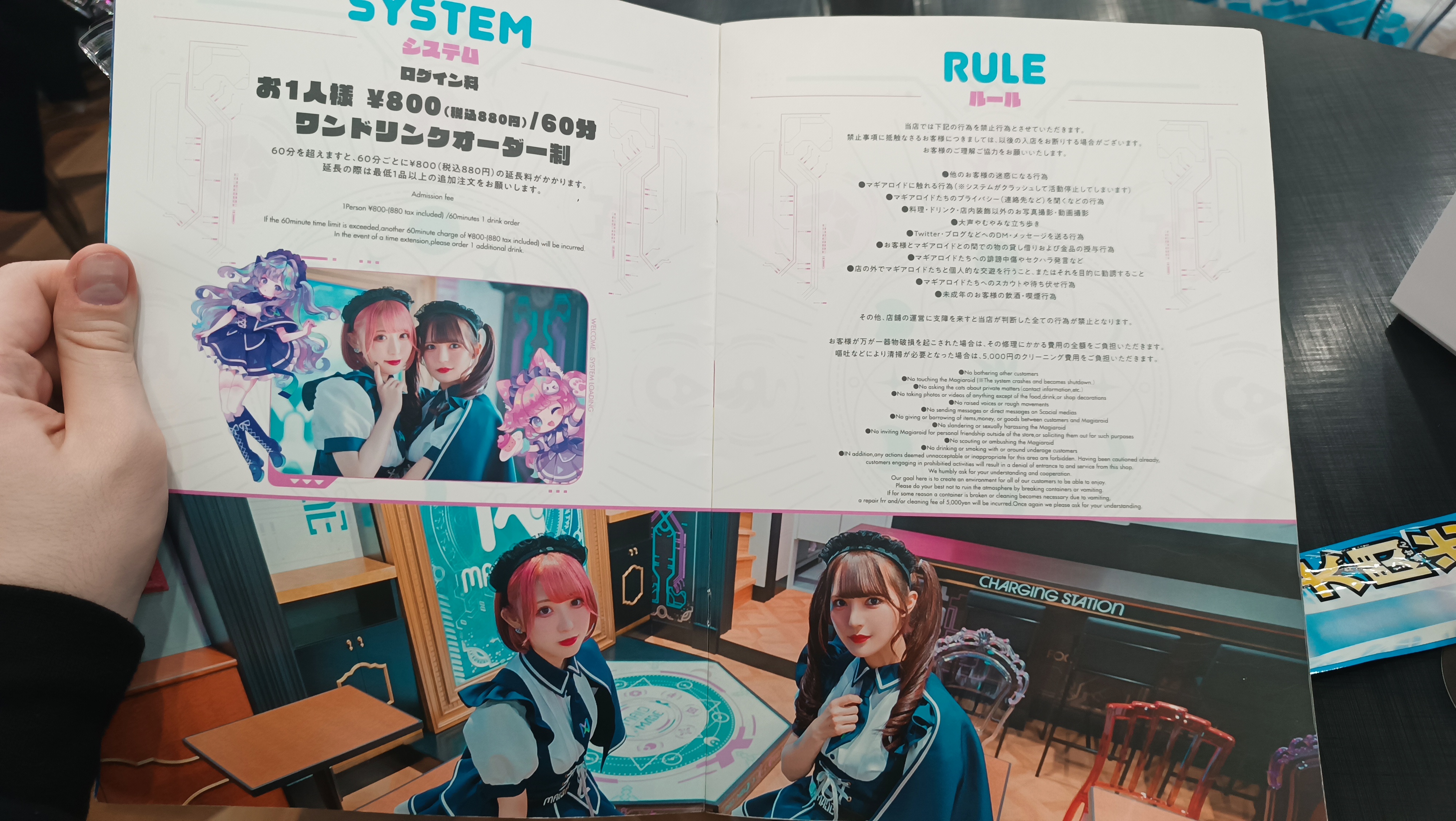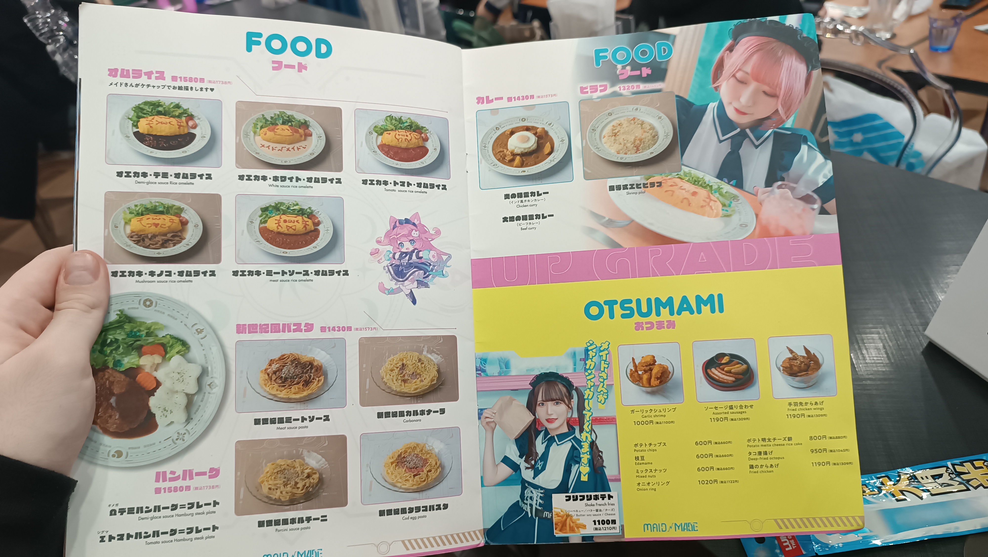 Там у них был чет типа "Мэйдо-бизнес-ланч", страницу меню с ними можно разглядеть только на этой фотке. Он стоил вроде 2650. Это, условно, база, вряд ли твой заход в мэйдошную сможет быть по чеку меньше этого, если ты не совсем на голодании.