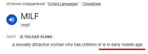 >>442583 Хз по какому "православному" ты там считаешь, милфами обычно называют горячих женщин в возрасте, наличие ребёнка роли не играет, как и их распутность.