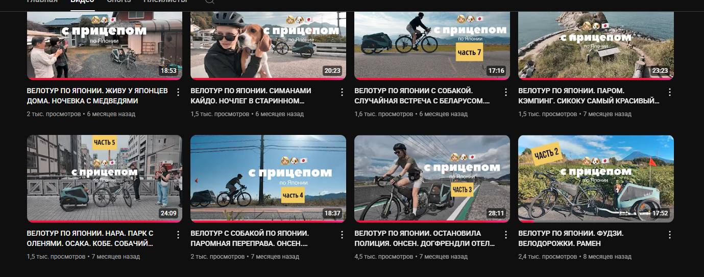 https://www.youtube.com/@harpo_beagle Вкину еще у этой тян почему то алгоритмы ютуба дико насрали и она походу забила хуй на канал. Но у нее лежит серия видосов (штук 20) как она на велосипеде с собакой хуярит через всю японию. Целый роадмуви, снято збс.