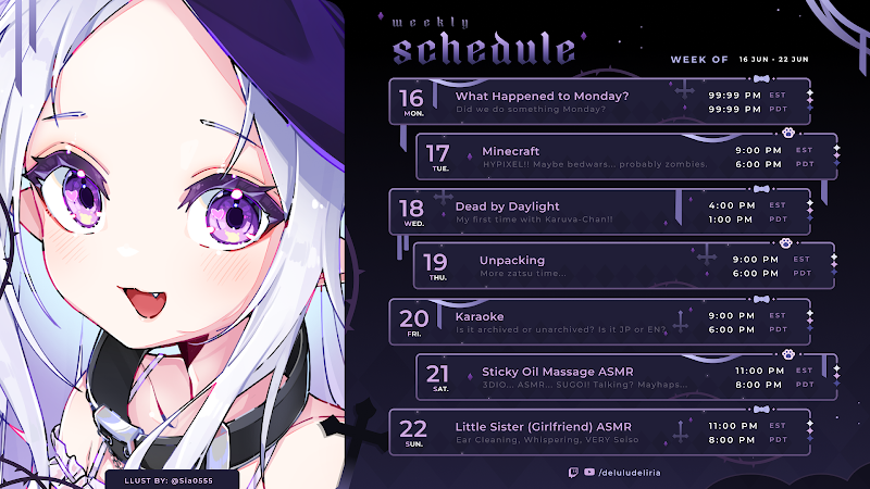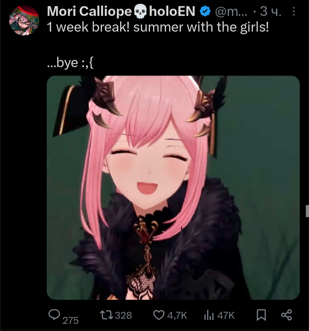 Твисти/Делюлю уже по факту съебалась от нижи. Выложила расписание и пост с планами. Не наебала на инцест лоли, и поставила на воскресенье какой-то подозрительный Little Sister (Girlfriend) ASMR....... Проведет ребрендинг, на Делулу будет АСМР, на втором - Мануруру Некоко блять - будет греть своих 2,5 симпов стримами. Конец всей истории.