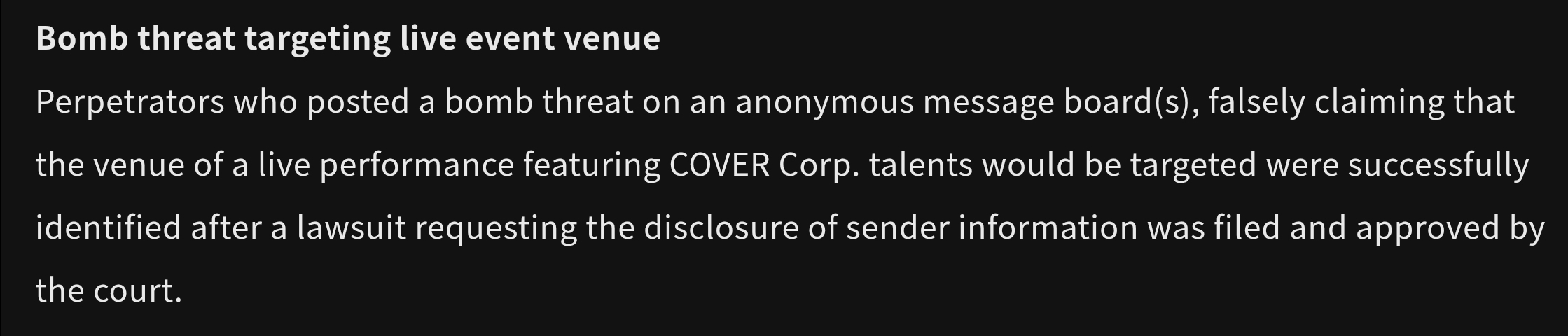 >>464347 Я кстати хз что там у ковра такого на что нужно 700 человек, это реально загадка. Может организация больших ивентов типа концертов и коллабов с бейсболом? Хз. У ниджей я кстати погуглил везде инфа про 200~ человек стаффа на 187 вибутеров. Вот тут с другой стороны мне каждется людей очень мало, хотя я ниджей не смотрю, но может там все витуберы самостоятельные и компания на них хуй кладёт, тут тоже непонятно. Сравнивать такие цифры сложно, хуй знает какая компания здесь права и кто правильно организовывает бизнес.