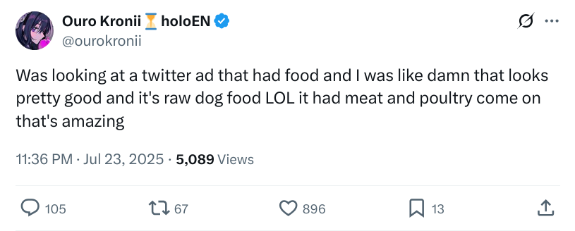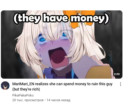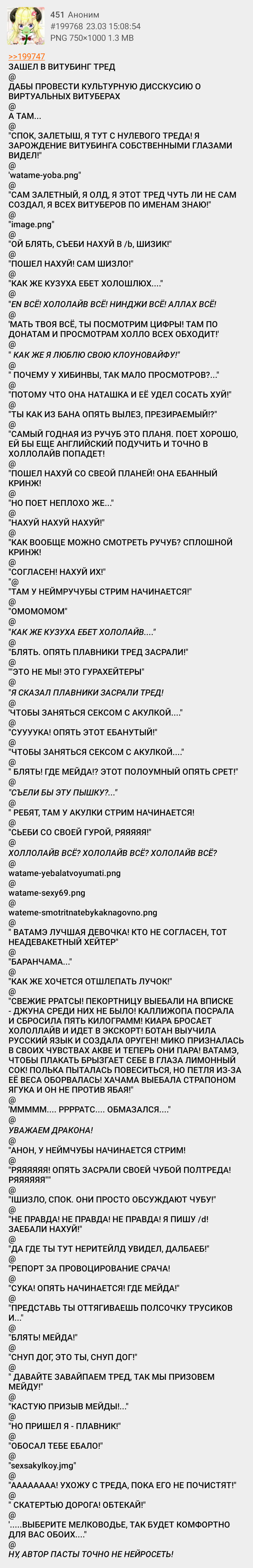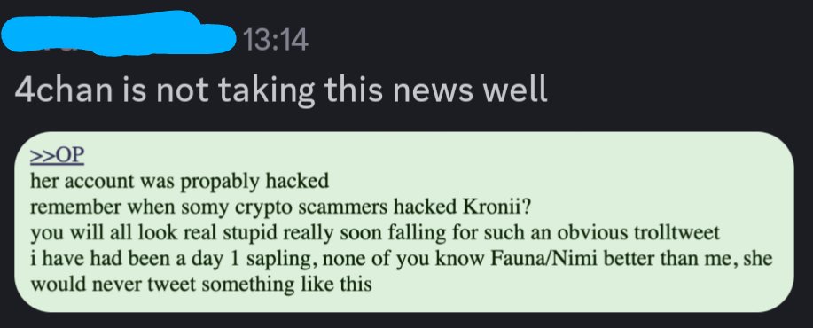Никогда не смотрел никого из хололайва, а тут, на фоне всех последних событий, зашёл почитать форчан, а вышел оттуда с ебалом грустной лягушки. Теперь, видимо, буду смотреть Крони.