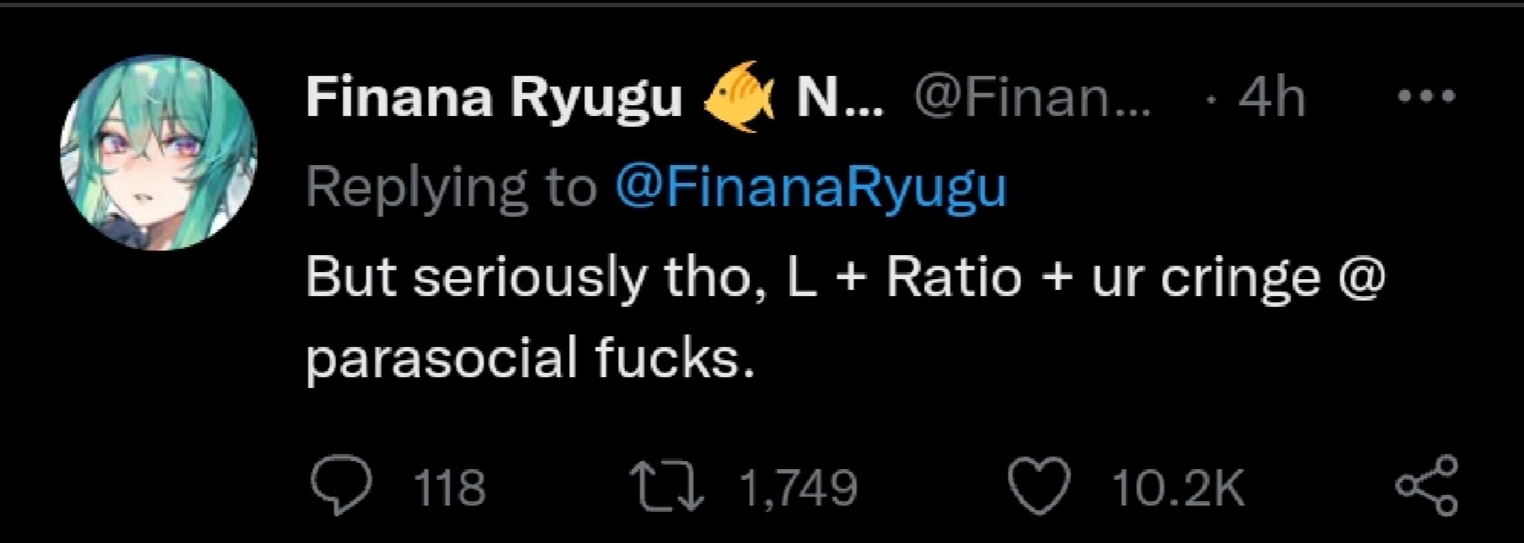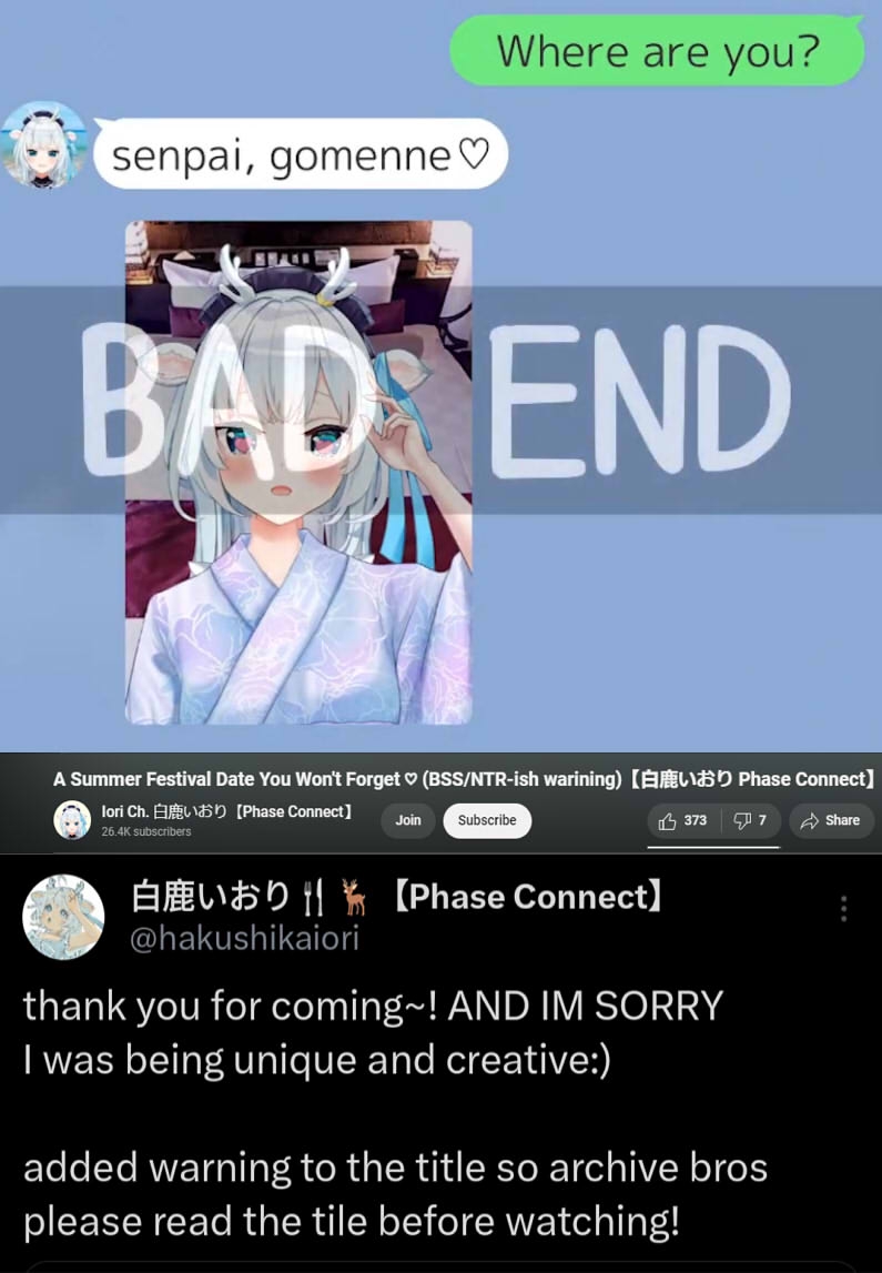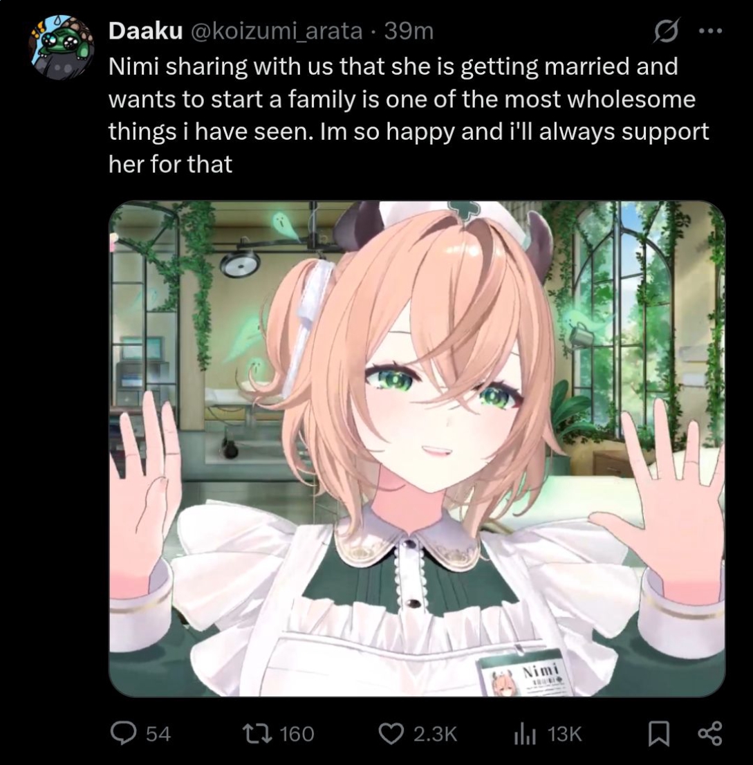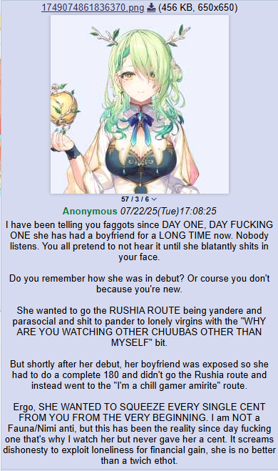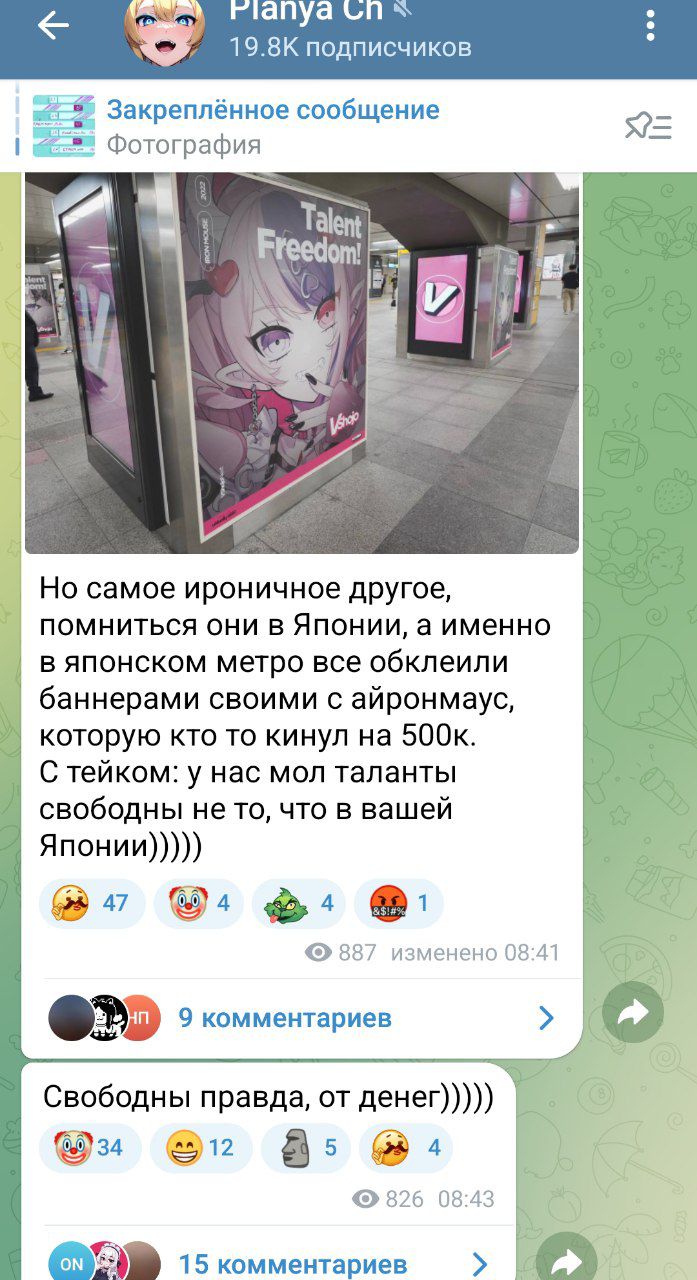 С Ними подрыв конечно неудивителен и понятен, но мне кажется, что это скажется на её карьере чуть менее чем никак. Возможно ещё и прецедент для остальных создаст. В прекращении лицемерия ничего страшного не вижу. Насчёт куколдизма тема более тонкая: понятно что айдолы должны быть типа дохуя пьюр и верджин, и что на многих чуб это тоже распространяется, и понятно также, почему. Но имхо реально прибабахнутых дрочеров трогающих экран не так уж и много осталось, хз может у японцев такая тема пораспространеннее, но за пределами - сомнительно. Мне кажется, что витуберы от айдолов отличаются примерно так же, как дом 2 от журнала мир звёзд - и там и там сплетни, драмы и жизнь в паблике, но в первом случае есть специфика буквального круглосуточного лайв-шоу, и интересно уже не столько наблюдать за творчеством, трансформацией образа и выходами в свет, сколько за общей динамикой сюжета, да ещё и с некоторой долей личного присутствия. Многим чубам в ответ на флирт вообще отвечают ew или pls respect my boundaries, ну какой тут куколдизм.
