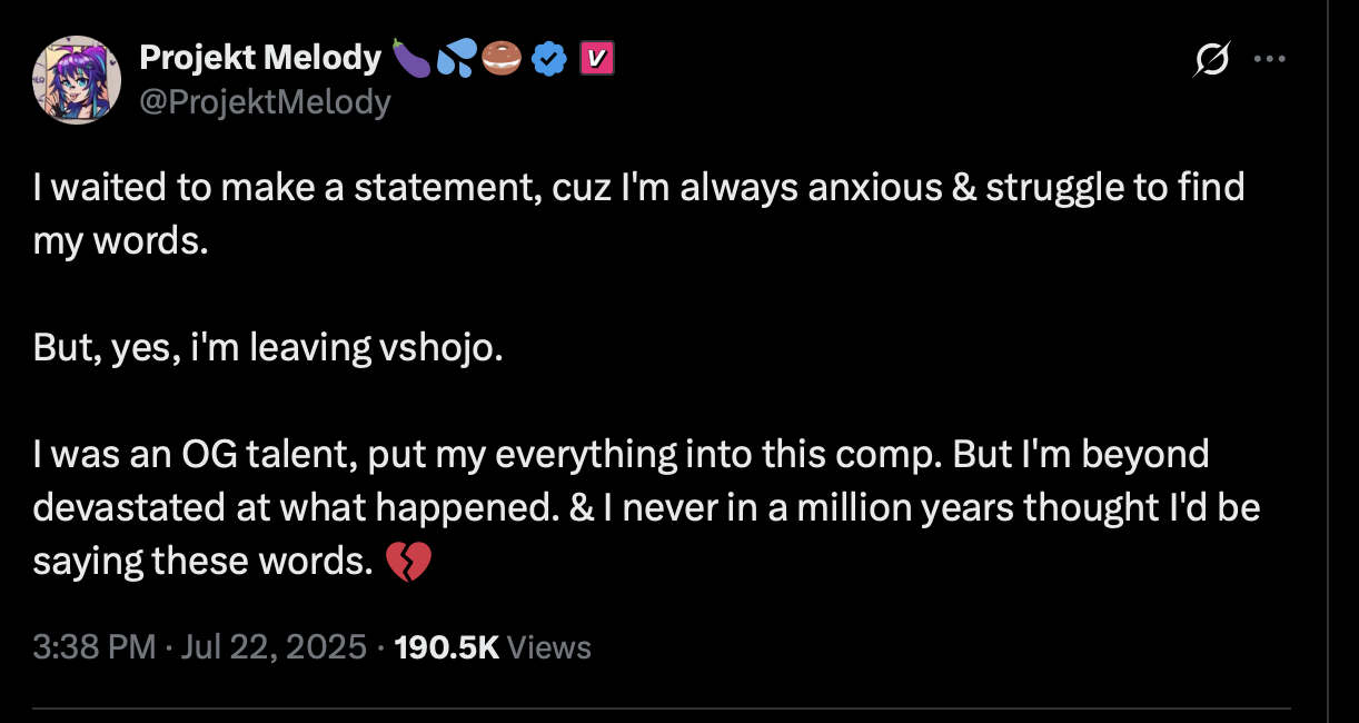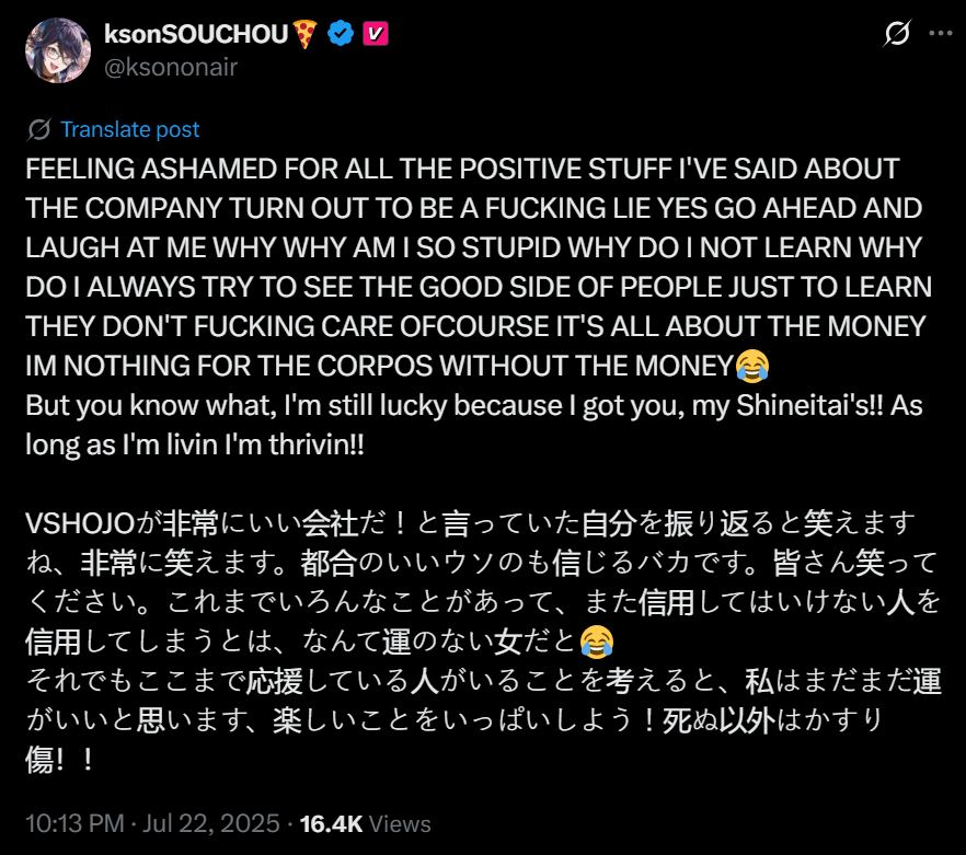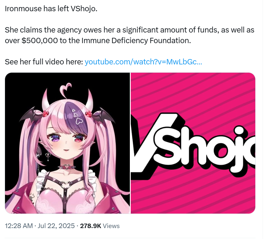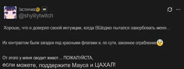 Вшоджо удивили, наебать с выплатами на благотворительность это какой-то рарный цинизм, даже на фоне куросанджи выглядит весьма стрёмно. И это не касаясь контекста с самой мышью и насколько для неё это личная проблема. Ну и в целом ахуй какой-то, у них там большинство стримеров пиздец титаны определяющие каждая свой жанр, пара зачуханых тоже есть офк но по большей части очень известные и большие, а они их скамят, а те терпят. Ебала какая-то.