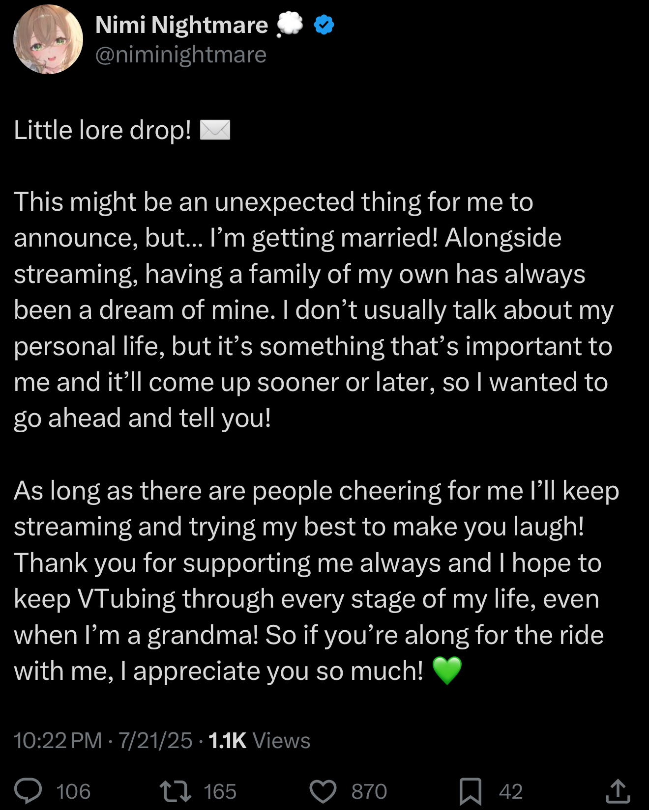 >>469785 Вообще молодец что не стала скрывать, об этом всё-равно бы потом всякие шизы сталкеры зазнюхали, а так получает ачивку за честность с адиторией. Даже стал её больше уважать. Всё-таки для витуберши сказать что женится это не абы какой вызов в карьере, тут некоторая смелость всё же нужна.