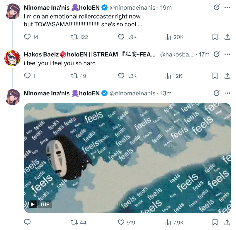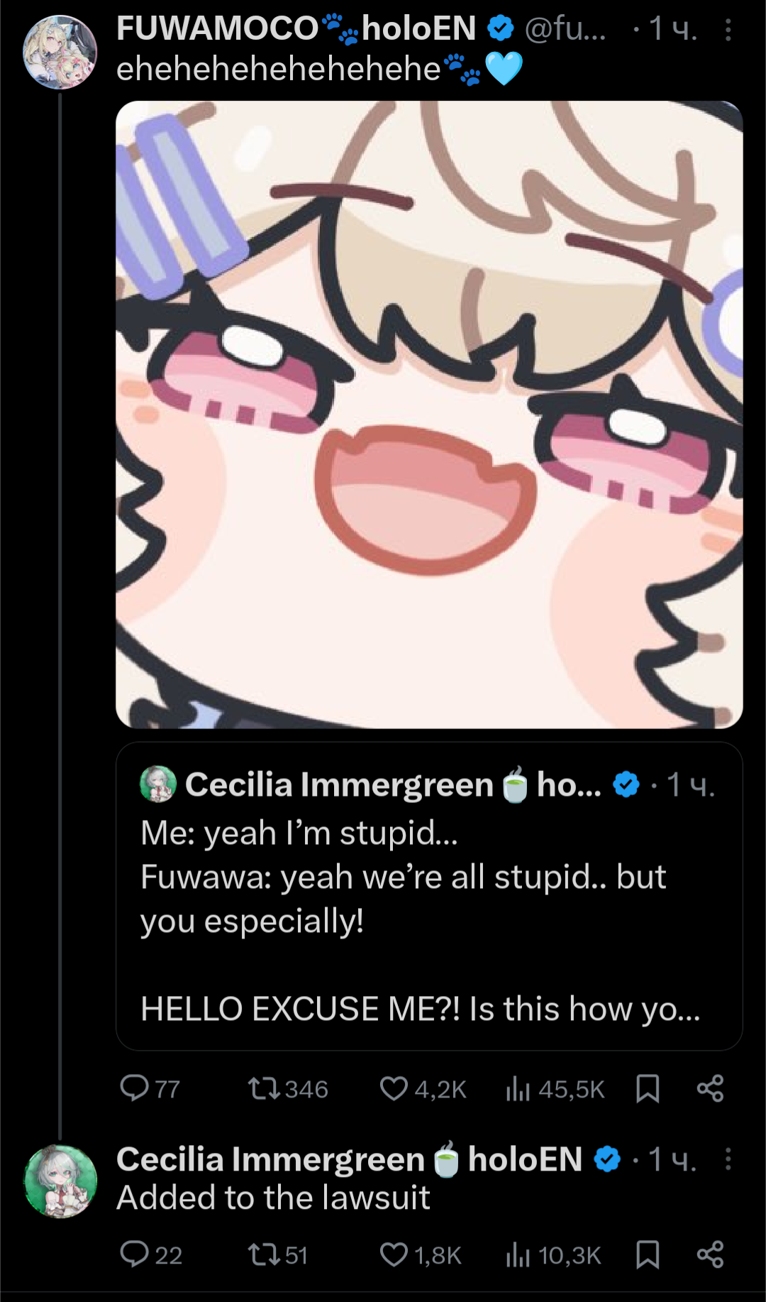 >>473607 >Пару раз был на стримах Даже шутить не буду. >выглядело отвратительно Обычная речь. Бесит только сам тон которым она говорит ватафак, звучит так, как будто она с пелёнок привыкла это восклицание выговаривать и пихает его к месту и не к месту на автомате. >Есть полно девочек в холо которые не матерятся и от этого контент только выигрывает. Та же крыса только проигрывала. Когда начала материться и перестала так прям выдавливать из себя ненатуральный смех — её сразу стало интереснее смотреть. >просто надо принять Что же её тогда все остальные в холо не принимают? Из энок матерятся почти все. Даже Ину вот возьми — дурные слова из неё не вылетают, но только потому, что она и в жизни так же привыкла. Не помню, как она там рассказывала, вроде говорила что в целом могла фак сказать, но редко, поэтому и на стримах такого нету. Но! У Ины как раз есть причина поддерживать такое поведение. У неё огромное сообщество такодачисов, которое привыкло к чилловым стримам, им такое тупо подходит. Вот прям реально. И это охуенно! Чуба прям с головой внутри того, как её аудитория чувствует её стримы. Она свой образ поддерживает ради них, и им этот образ очень нравится. Флаг ей в руки и пусть продолжает. Туда же Баусы, идеально под их образ. Туда же биба с её аудиторией малолетних скибиди, хотя её исполнение мне лично не нравится, думаю что как раз ей бы пошло на пользу начать материться. А у Лизки какая причина? Есть хоть что-то, связанное с её аудиторией, или спецификой её стримов? Хоть что-нибудь? >>473609 Самое смешное, что как раз Калли год-два назад проводила стрим где мемилась типа "я стала меньше материться, знаете почему? Вот посмотрите что мне фанат написал. Такое мог написать только 10летний дебил. Значит, меня смотрят и люди младше 18! Поэтому буду стараться меньше материться".
