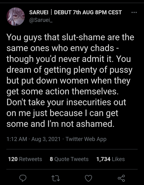 >>473221 Я про то, что у неё не было посыла "шлюх шеймят, а чедов почему-то нет", посыл был в том, что "вы шеймите шлюх, которые ебутся с чедами, хотя сами хотите быть как чеды и ебаться со шлюхами".