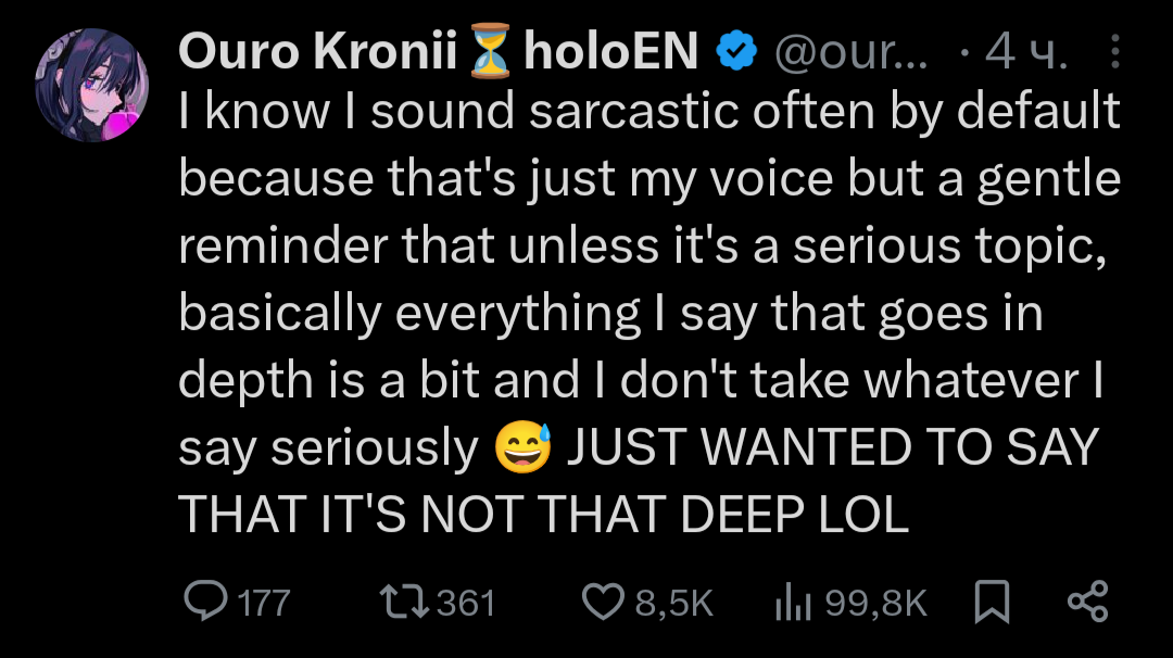 >>474686 Ключевой момент - это то, что все они поголовно не ебут, что такое витубер. Для них это аниме-аватарка, дополнение к собственной тушке, чтобы сесть на два стула и привлекать дополнительных симпов. Это не только на сручуб распространяется, но среди них это повально и пока никто не опроверг.