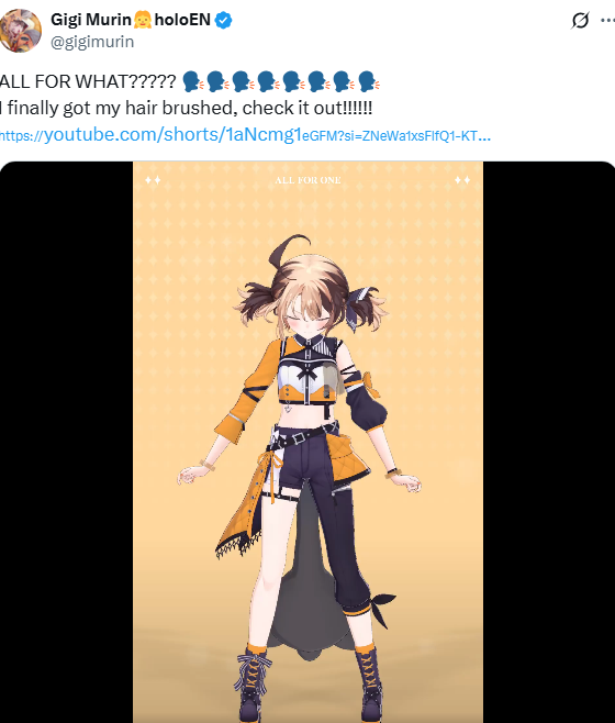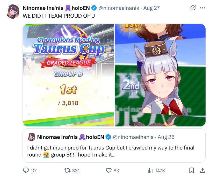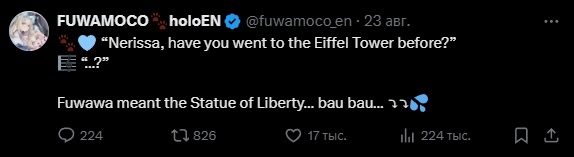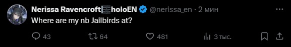 >>475028 Нерисса включила режим стервы и выбила себе скрытый отпуск после длительной японской арки, была слишком занята семьёй и племяшами с сёстрами, после концерта вернётся в строй, уже обещаны игровые коллабы с Шиори, кажись будут House of Ashes играть. >Честно скажу, хуй знает, зачем джейлберды смотрят её. Мы смотрим её не из-за игорей, это уж точно, для игродаунов есть Бибуу и прочие, нам просто нравится слушать её истории и тирады про всё подряд. Конечно твиттер спейс или комьюнити пост от неё не помешал бы на этой недели, а то совсем нет никакого хайпа по AFO концерту, а у неё сегодня ещё и Ворлд Тур а Нью Йорке. Вот вам мои безумные умения.