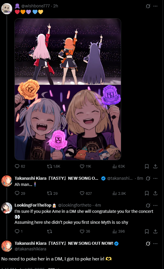 Тут посмотрел полностью день первый концерта. Пожалуй, мой топ: Все появления Бей и её поддержка Мифа. Песня Крони+Айрис и Товы-сан и их взаимодействие после. Алсо какая Това низенькая:3 и, наверное, Крони тут лучше всего отработала.