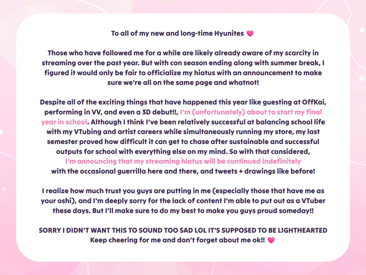 Можно было бы конечно над ней позубоскалить, и я бы с удовольствием бы это сделал, дабы побесить её фажика если бы не одно но. Мне знакомы данные симптомы, потому что я их переживал. Это проф. выгорание и если в случае с обычной работой её можно сменить, то вот с витуберами так не получится, и от этого дерьма даже полугодовой отпуск не факт не спасет. По хорошему ей бы к мозгоправу чтобы понять причину выгорания, с последующими попытками устранения, но сомневаюсь что Яго подобные мувы одобрит. Так что ждем через годик новую инди-витубершу.