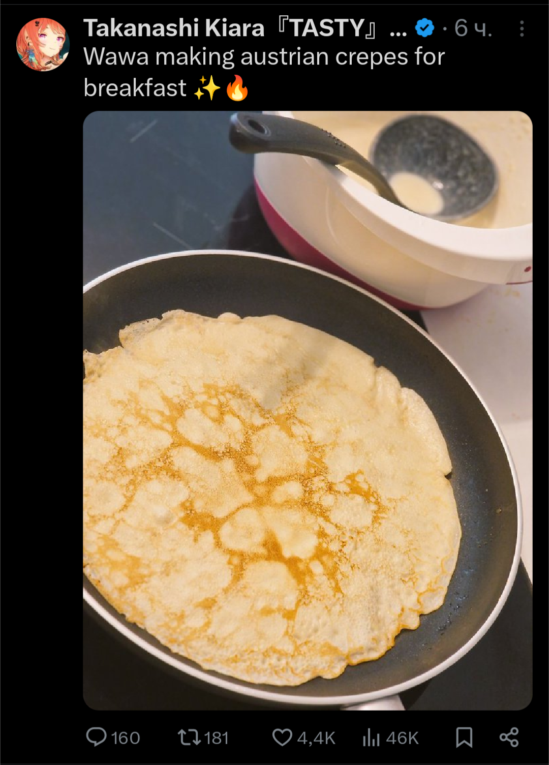 >>476981 Всё. Надо не а глаз хуячить, а наливать на хорошо разгретую сковородку, дать пару секунд схватиться и сразу же вылить излишки прямо через край обратно в миску. Тогда получится нормальный тонкий блинчик, а не оладья нахуй.