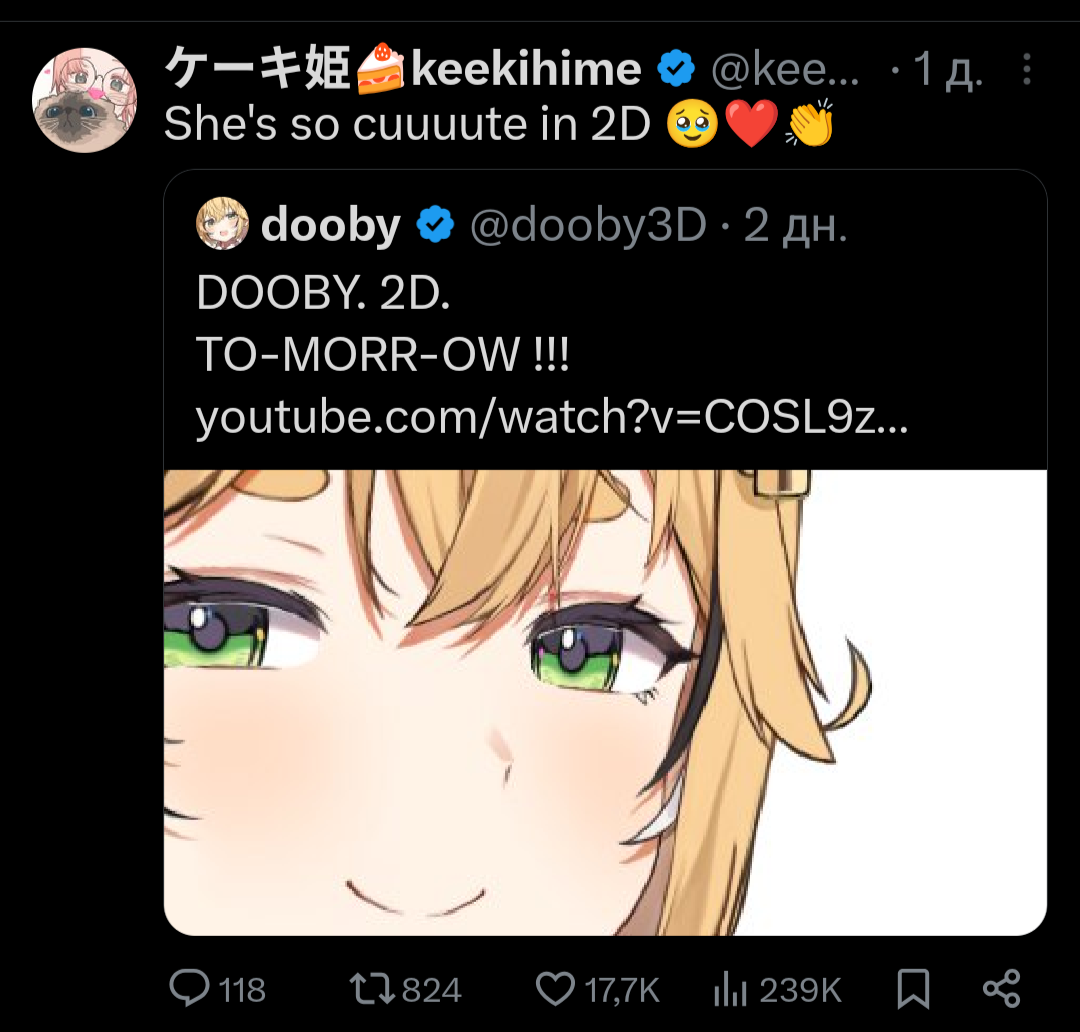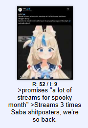 >>480345 >Рад, что ее милый смех расфорсился по борде, постоянно то и вижу то в б, то в политаче, да десяток досок наверное Это не только её, некоторых других витуберов тоже по доскам растащили.
