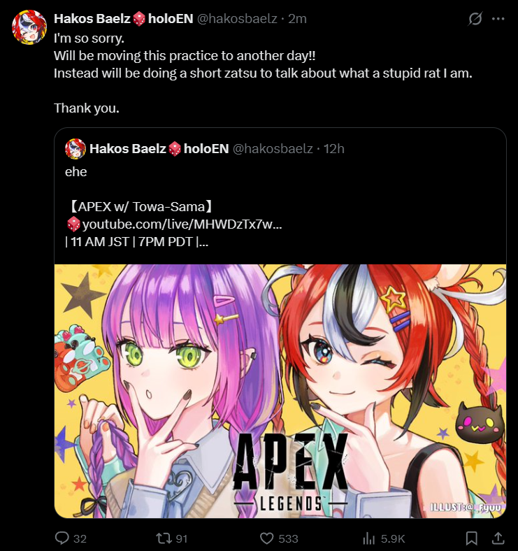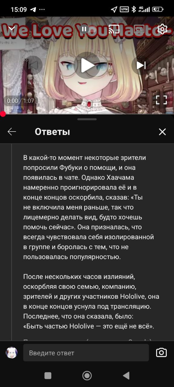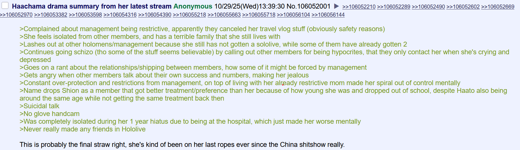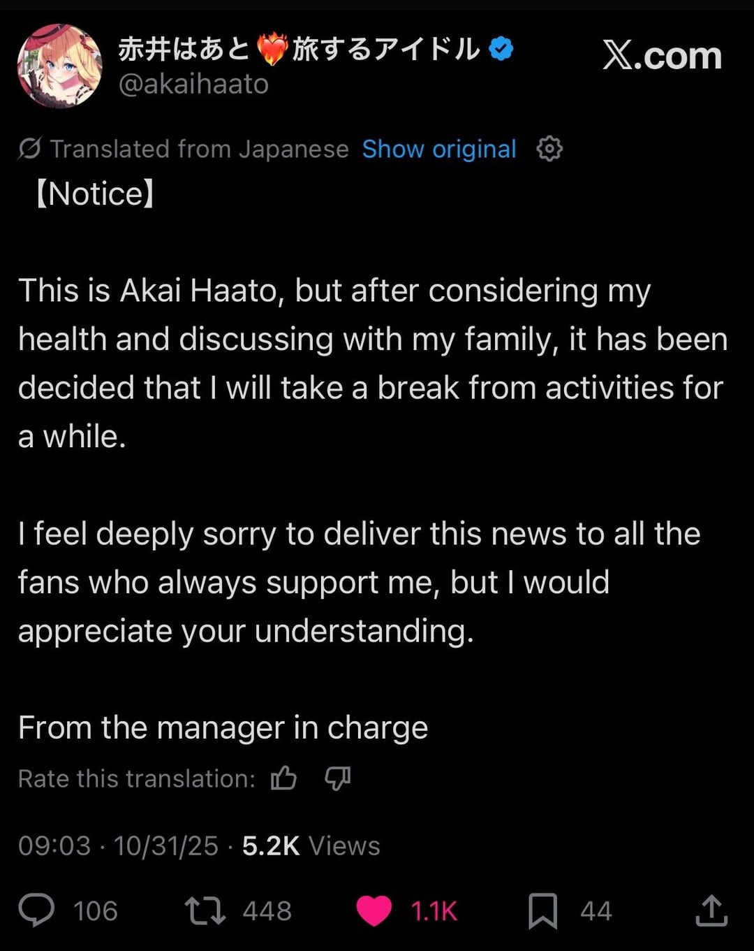 СРОЧНЫЕ НОВОСТИ: Представители Hololive официально сообщили о скоропостижной смерти айдола Akai Haato, известной также под псевдонимом Hachaama. Сегодня утром ее тело было обнаружено в палате — предварительно установлено, что причиной смерти стало повешение. Предсмертная записка не найдена, а записи с камер видеонаблюдения оказались удалены. На месте происшествия работает полиция префектуры Осака, расследование продолжается. Выражаем глубочайшие соболезнования семье, друзьям и поклонникам.