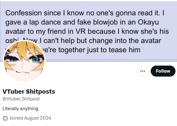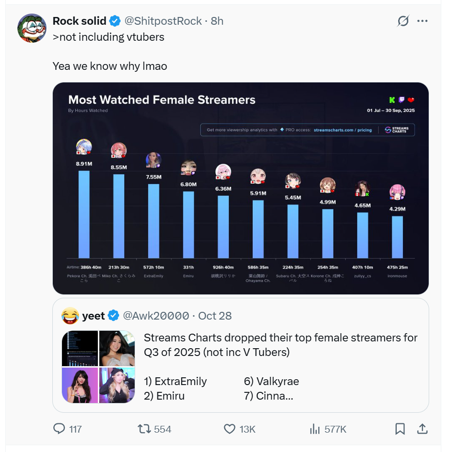 А, ну еще: наверное, есть такие, кто и стримы в целом не смотрел до витуберов. Или совсем эпизодически, по конкретной игрушке/какой-то теме. Смотреть кого-то конкретного, это ещё зачем. Твичешкуры ещё, вообще непонятно кто их симпит. Немного (2д аватарка и голос) оказалось нужно, чтобы затянуло в кроличью нору, да?