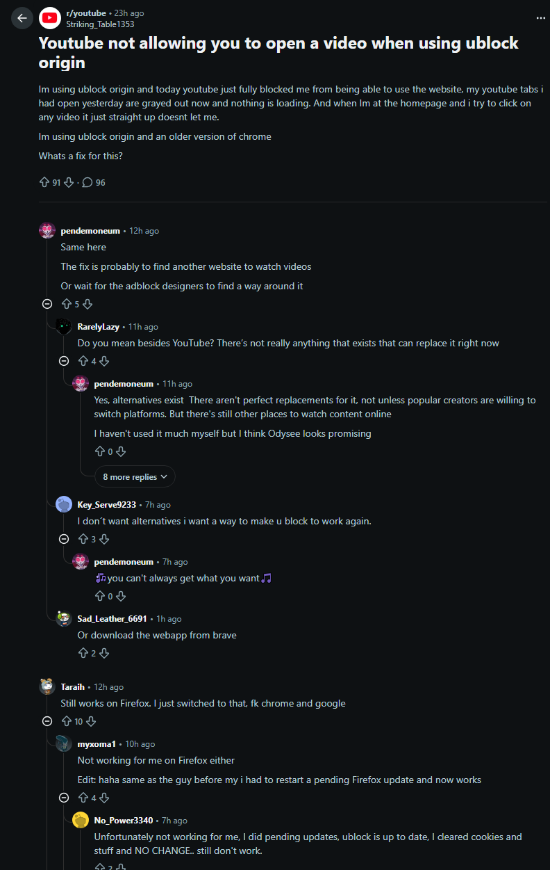 >>481434 Ютуб и дискорд работают, если скрываешь dpi >>481433 >Выключи Юблок на Ютабе тогда Так и пришлось поступить. >>481432 Реклам нет, но путем отключения расширений выяснил, что ломаются именно ютуб+юблок, в любом случае хуета.