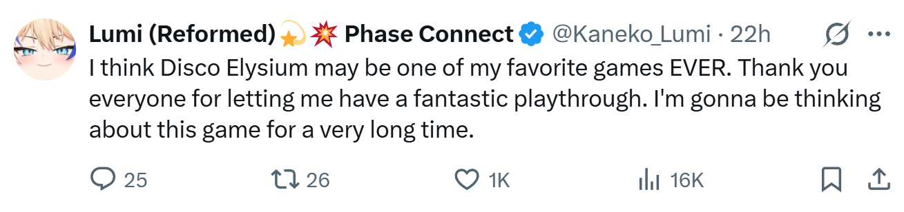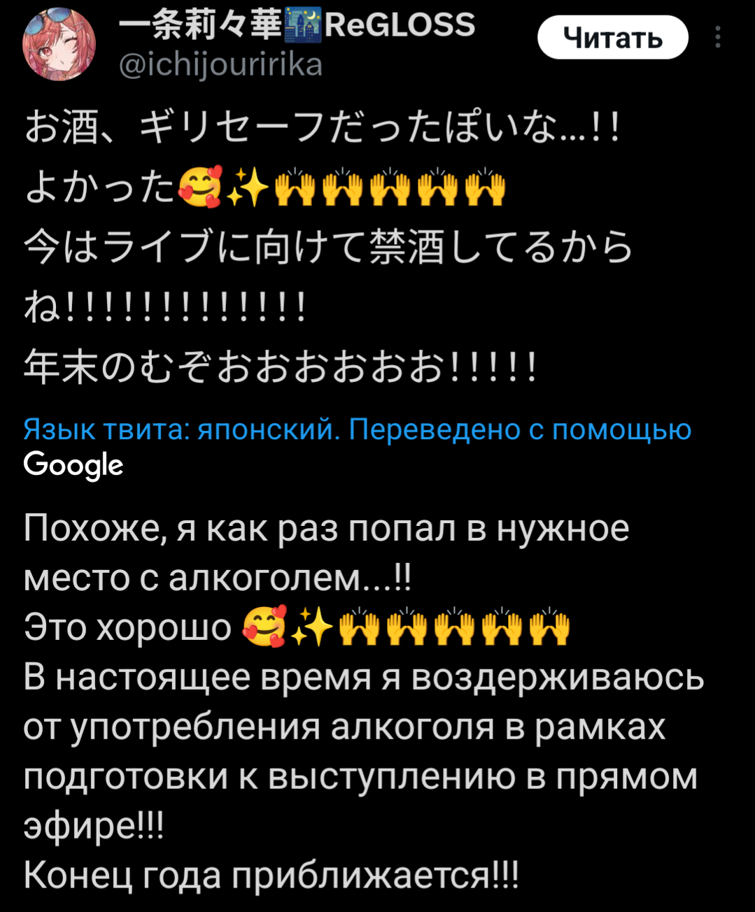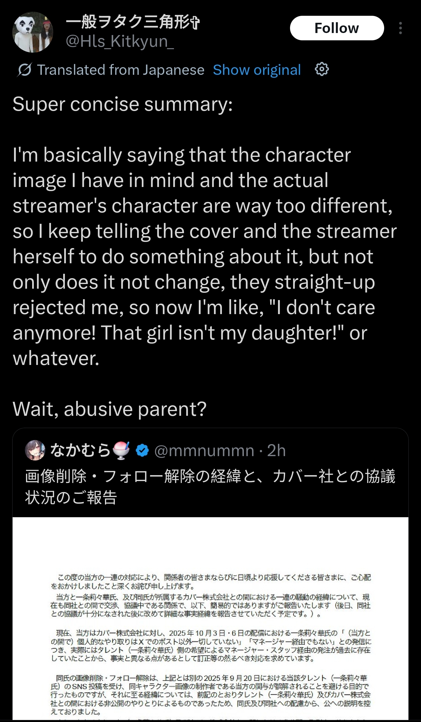 Удаление изображений с её участием и снятие подписки с неё не связаны с вышеупомянутым вопросом. Эти действия были предприняты мной после её публикации в соцсетях 20 сентября 2025 года — чтобы избежать возможных недоразумений относительно моего участия как создателя изображений её персонажа. Однако объяснить это публично я тогда не мог из-за закрытого характера взаимодействия между таланткой (госпожой Итидзё Ририка) и Cover Corporation, и из уважения к ним воздержался от комментариев.